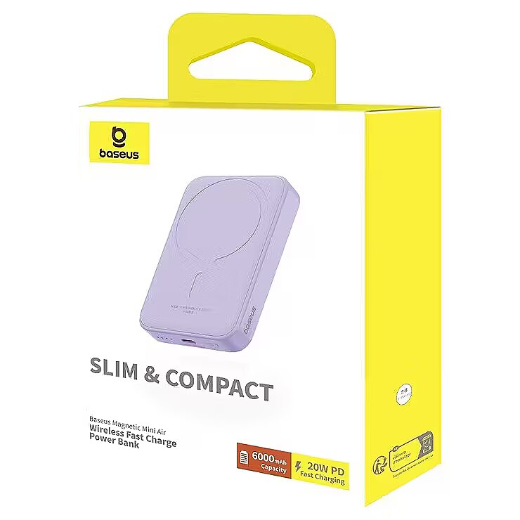 description_en - Baseus Magnetic Mini Air Powerbank (Model P10059002513‑00)A slim and lightweight 6000 mAh power bank with magnetic (MagSafe) wireless charging support. Provides fast wired charging up to 20 W and wireless charging up to 15 W. Capacity: 6000 mAh (~22.2 Wh), real usable ~3500 mAh Input (USB‑C): up to 18 W (5 V/3 A or 9 V/2 A) Output (USB‑C): up to 20 W (5 V/2.4 A; 9 V/2.22 A; 12 V/1.5 A) Wireless charging: up to 15 W (Qi, MagSafe compatible) Safety: multi‑level protection including temperature sensor LED charge indicator