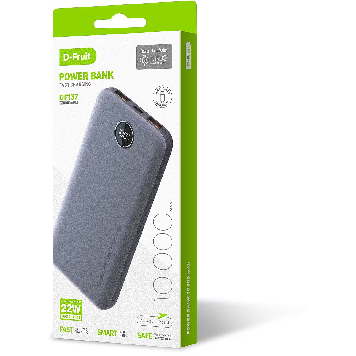 • 10,000 mAh battery • Built-in USB-C cable with 20W PD charging • USB-A port with 22.5W AFC technology • LCD screen for battery level monitoring • Lightweight and compact design, suitable for use on planes
