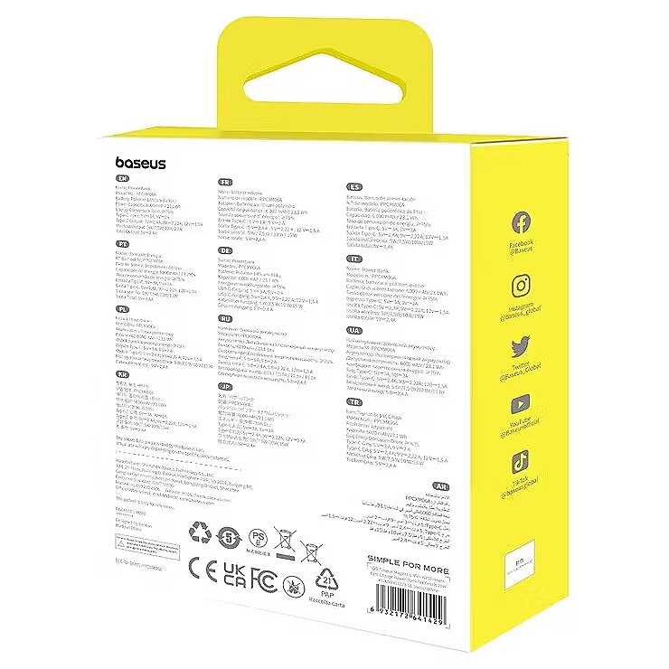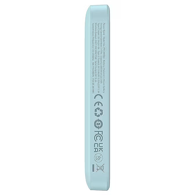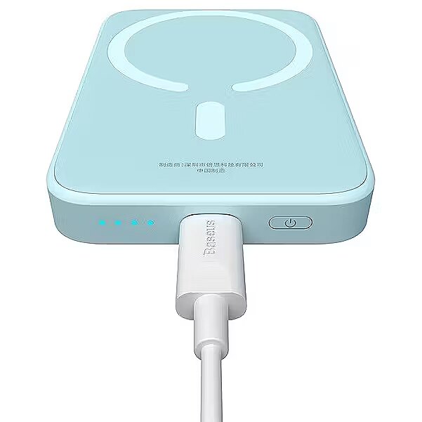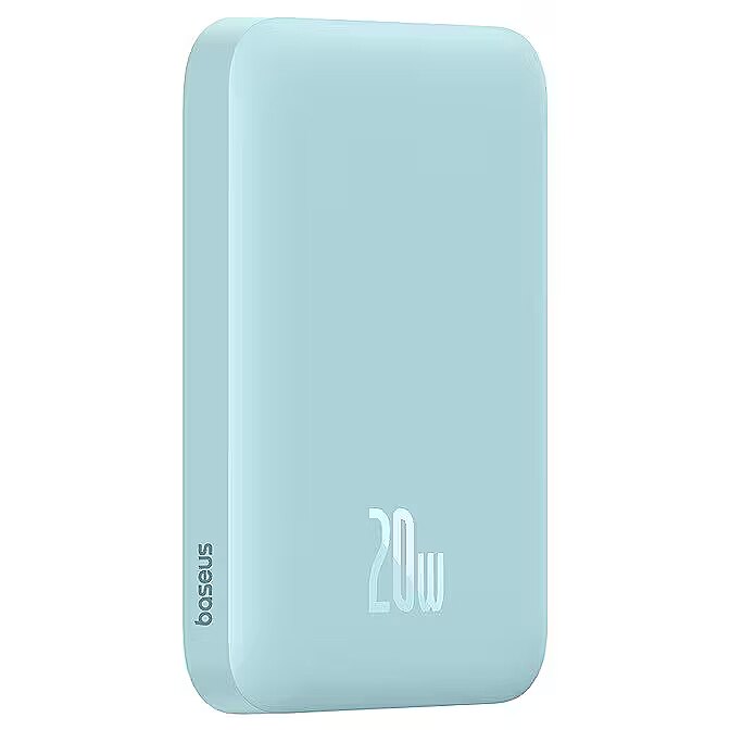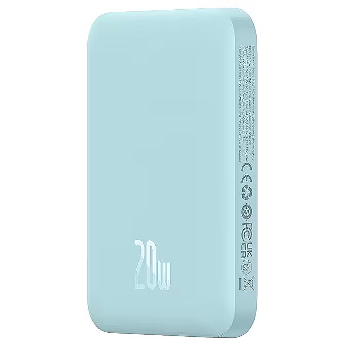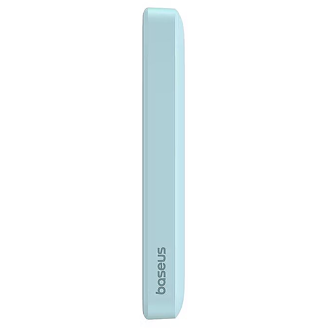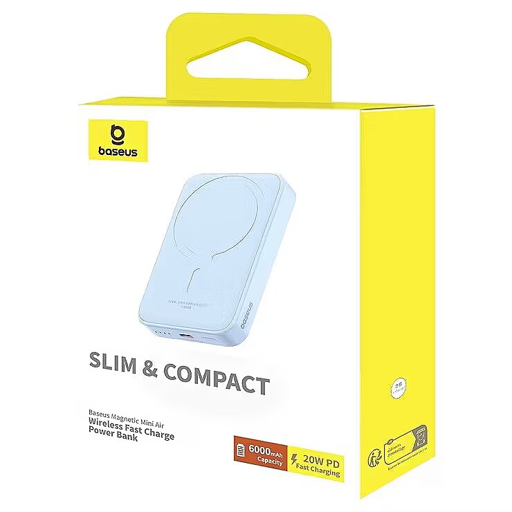 description_en - Baseus Magnetic Mini Air Powerbank (Model P10059002313‑00)A slim and light 6000 mAh power bank (~22.2 Wh) that supports fast wired charging up to 20 W and magnetic wireless charging up to 15 W (Qi/MagSafe). The blue plastic housing is made of PC+ABS. Includes a USB‑C cable. Capacity: 6000 mAh (~22.2 Wh), actual usable ~3500 mAh Input (USB‑C): 5 V/3 A, 9 V/2 A (up to ~18 W) Output (USB‑C): 5 V/2.4 A, 9 V/2.22 A, 12 V/1.5 A (max. 20 W) Wireless charging: up to 15 W with magnetic alignment (MagSafe compatible) Safety protections: overvoltage, overcurrent, overheating, short circuit (NTC sensor) LED battery indicator Housing material: PC+ABS plastic Color: blue