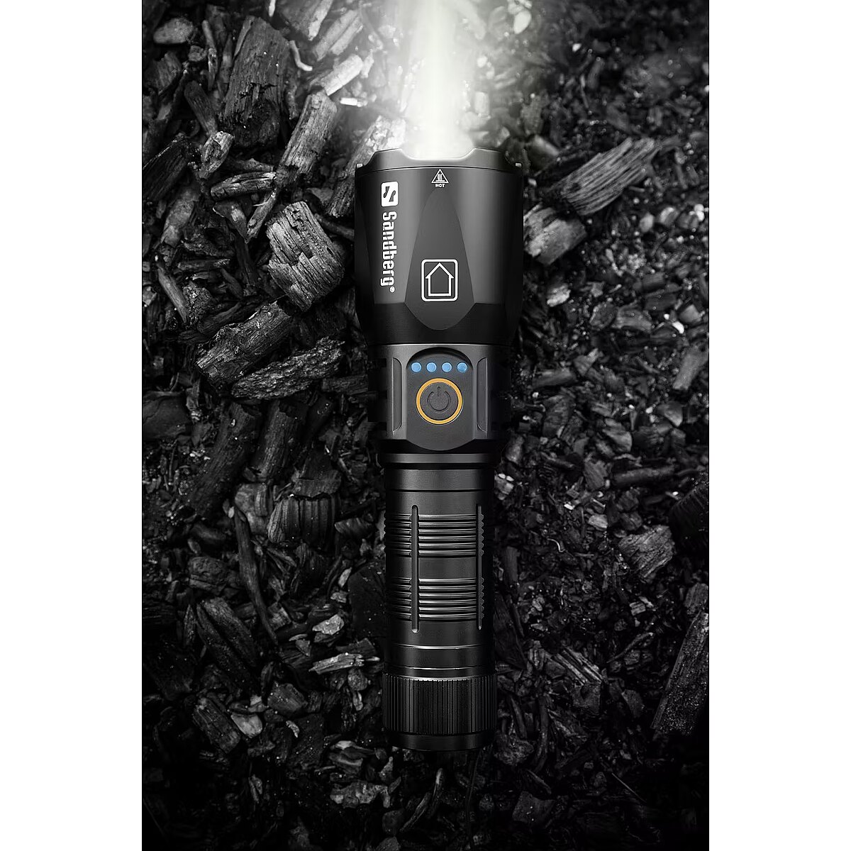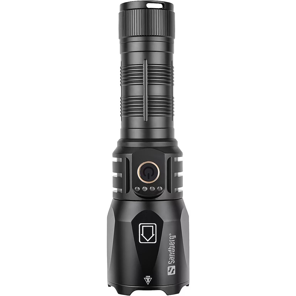 LongSummaryDescription - Sandberg Survivor Torch Powerbank 5000. Flashlight type: Hand flashlight, Product colour: Black, Housing material: Aluminium. International Protection (IP) code: IPX4, Operating temperature (T-T): -30 - 40 °C, Certification: FCC, RoHS, UKCA, CE. Lamp type: LED, Luminous flux: 1200 lm, Light beam distance (max): 500 m. Charging source: USB, Battery technology: Lithium-Ion (Li-Ion), Battery capacity: 5000 mAh. Battery capacity: 18.5 Wh