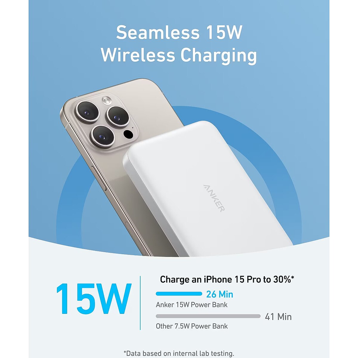 LongDesc - Leading with Unmatched SlimnessFits comfortably wherever you need it, providing power on-the-go with its sleek design. (Note: Based on internal comparisons with previous Anker models.) Next-Level Wireless ChargingAnker's proprietary Wireless PowerIQ™ technology delivers higher efficiency through a high-conductive aluminum Qi2 module that ensures consistent 15W charging and superior heat management. Safeguarded PowerThe ActiveShield™ safety system continuously monitors temperatures over 3 million times daily, providing total peace of mind by maintaining operation temperatures below 104°F, significantly cooler compared to the industry standard of 118.4°F. For MagSafe-Compatible DevicesDelivers a full 15W of power for perfect compatibility with MagSafe-equipped iPhones, even through magnetic cases. CompatibilityiPhone 16 / 15 / 14 / 13 / 12 SeriesFor AirPods (1st / 2nd / 3rd Gen) and AirPods Pro (With Wireless Charging Case)And More