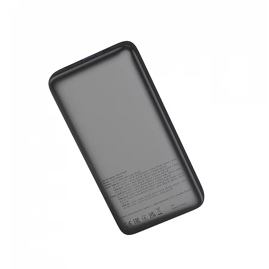 LongDescription LV - Maksimāla veiktspēja jebkurā vietāIdeāli piemērots darbam un ceļošanai – OnPower 240 ļauj vienlaikus uzlādēt viedtālruni, planšetdatoru un portatīvo datoru bez liekas gaidīšanas. 140 W PD 3.1 – pietiekami jaudīga uzlāde portatīvajiem datoriemPower Delivery 3.1 standarts atbalsta lielas jaudas ierīces, piemēram, MacBook, nodrošinot ātru un efektīvu uzlādi arī prasīgākajiem darbiem. PPS – inteliģenta uzlādePPS tehnoloģija reāllaikā pielāgo spriegumu un strāvu konkrētajai ierīcei, samazinot siltuma izdalīšanos un paildzinot akumulatora kalpošanas laiku. Ātrā uzlāde visām ierīcēmAtbalsts QC 3.0 un AFC nodrošina līdz pat četras reizes ātrāku uzlādi Samsung un citām saderīgām ierīcēm. 25 000 mAh ietilpība – enerģija vairākām dienāmLielā kapacitāte ļauj vairākkārt uzlādēt viedtālruni, ilgstoši lietot planšetdatoru vai darbināt portatīvo datoru situācijās, kad nav pieejams elektrības pieslēgums. Divpusēja ātrā uzlādeIerīču uzlāde un pašas baterijas uzlāde iespējama vienlaikus – ērti, ja steidzaties vai atrodaties ceļā. Reāllaika informācija par akumulatoruDigitālais displejs sniedz precīzu informāciju par atlikušās enerģijas daudzumu, ļaujot jums labāk plānot uzlādes laiku. Droša un uzticama lietošanaSeši iebūvēti aizsardzības slāņi pasargā jūs un jūsu ierīces no pārkaršanas, pārsprieguma, īssavienojuma un citiem riskiem. Lidmašīnām piemērots dizainsAr kompakto formu un 89 Wh jaudu OnPower 240 atbilst rokas bagāžas prasībām un ir piemērots pārvadāšanai lidojumu laikā.
