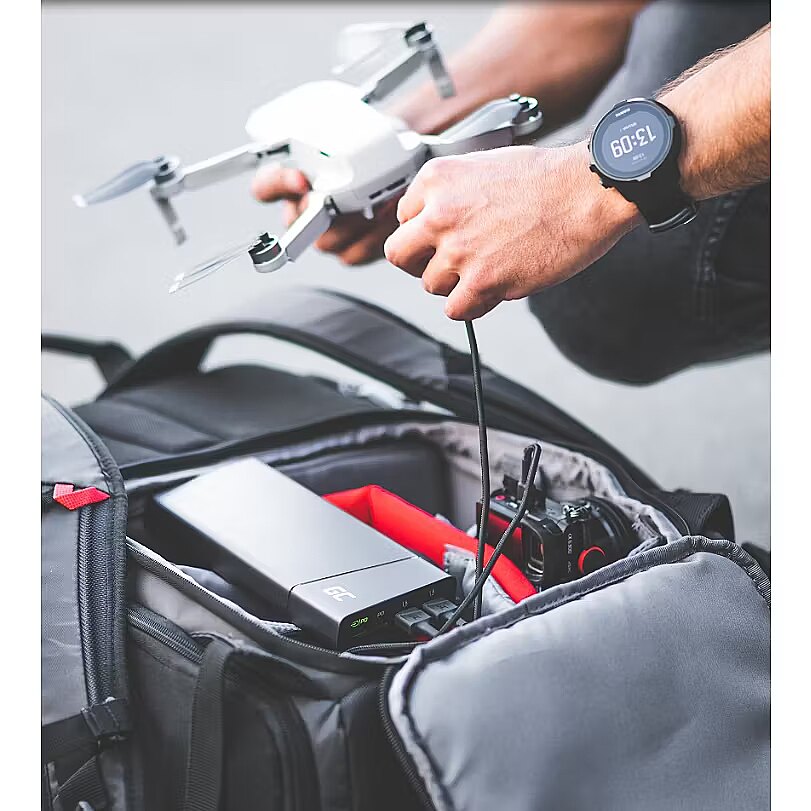 Description - Powerbank PowerPlay Ultra 26800mAh The GC PowerPlay Ultra has four fast charging ports for a total of 128W, which will allow you to charge your laptop, tablet and smartphones simultaneously - and at top speed! The power bank itself will charge just as quickly, in just 2 hours With a capacity of 26,800 mAh, the power bank allows you to charge 1.4x MacBook Pro 13, 2x iPad Pro 12.9 or 7x iPhone 12 and is perfectly within the limits of air transport Double tap on the power bank case to find out how much power is left in it. The green LED bar will then light up to the appropriate level The free power pass-through function allows the power bank to charge simultaneously, as well as all devices connected to it, so it can serve as a multi-port charger