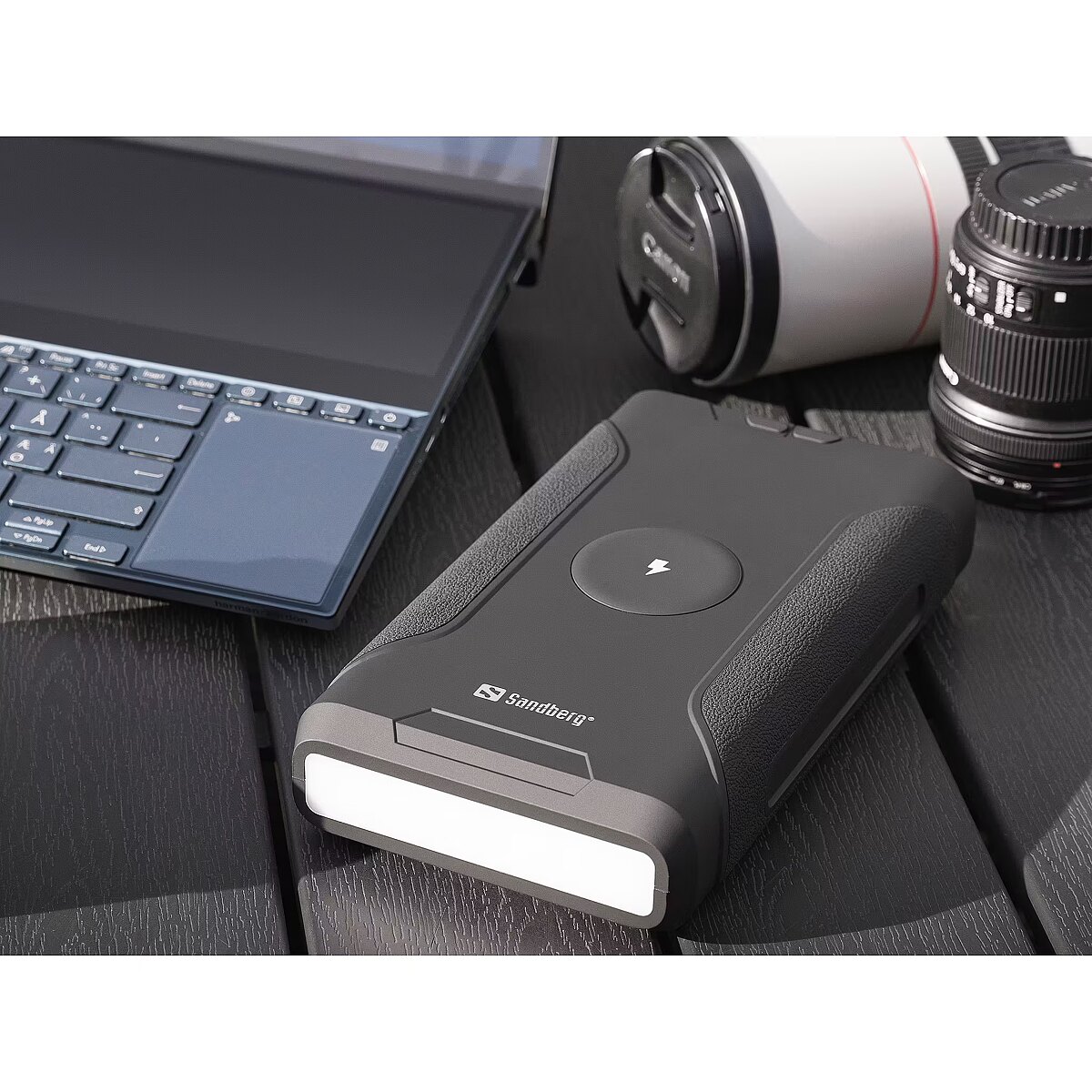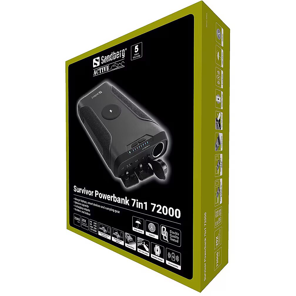 LongDesc - Sandberg Survivor Powerbank 7in1 72000 is the ultimate transportable charging station for just about all your gadgets. The enormous capacity 72000 mAh battery is more than enough to charge your smartphone every day for almost a month. It comes with a wealth of outputs for a range of charging purposes:2 x USB-C for charging USB-C devices such as laptops, smartphones, tablets etc.1 x USB-A QC for charging USB devices such as smartphones, tablets, digital cameras etc.1 x laptop DC outlet with cable and adapters for charging the vast majority of laptops.1 x powerful 180W/12V car charger for camping equipment, such as fridge or coffee maker.1 x wireless charger for supported devices.1 x flashlight with red and white lights.This heavy-duty powerbank comes in robust water-resistant materials, and is perfect for the wild outdoors, festival goers or sales executives on the move, who’ll need lots of power for their devices.