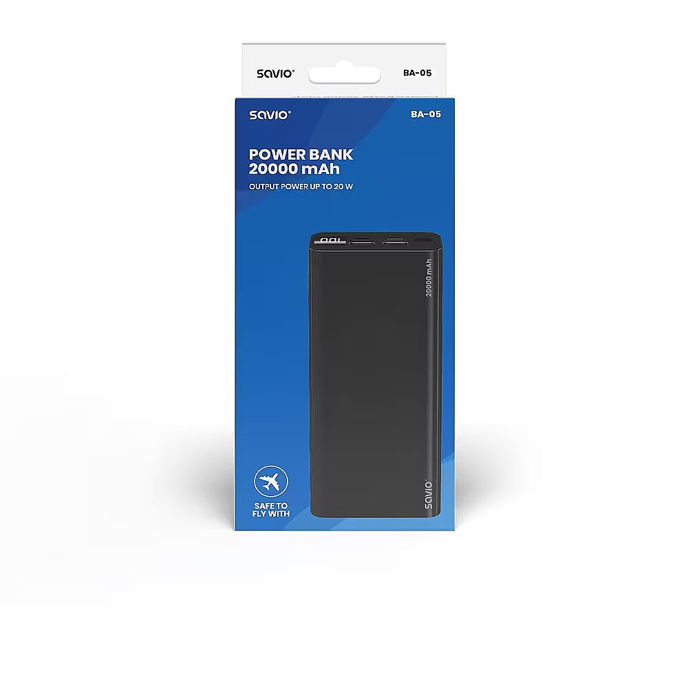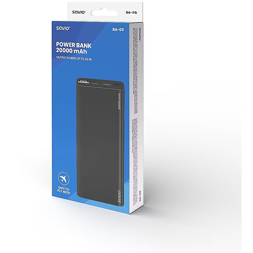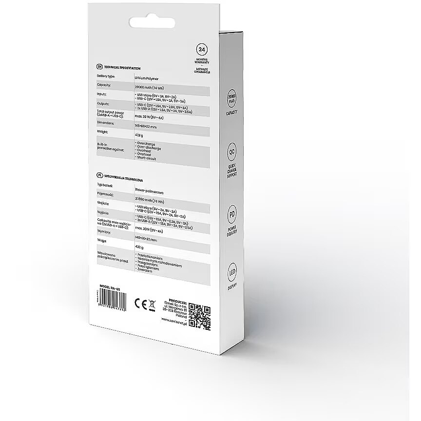 Description - The BA-05 power bank is a functional accessory for charging portable devices such as smartphones, tablets, and smartwatches. Its compact size and design make it easy to carry and practically use during trips. The product features a big 20000 mAh battery. It allows you to charge your devices multiple times, extending their usage up to several hours. The lithium-polymer battery is protected by a durable case. The design is perfect for travel you can take it on a plane without any problem. The elegant design grabs your attention and fits perfectly surrounded by modern devices. The BA-05 has been additionally covered with an anti-slip surface to improve comfort and safety at work. The power bank is equipped with USB-C and 2x USB-A output ports. You can charge up to 3 devices simultaneously. You can control the power level with the easy-to-read LED display, which shows the percent charge level. In addition, if you are using the Quick Charge option, the display will notify you with a special icon. The model uses the modern Quick Charge and Power Delivery standards. They guarantee a fast charging process for any connected device. If your devices support these standards, you can enjoy the optimum level of voltage and current between the power bank and the charged device. The charging process will not only be shorter but also safer. The BA-05 power bank has many solutions that guarantee safe use. The case is resistant to scratches and hits. The case protects the batteries inside. High-quality materials and components have passed several safety tests. The comprehensive protection covers both the power bank and the device charged. The BA-05 has built-in protection against: overcharging over-discharge overheating overload short circuit