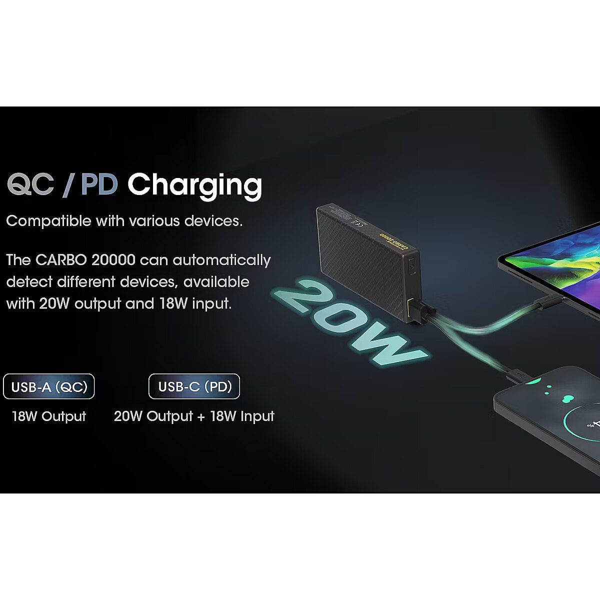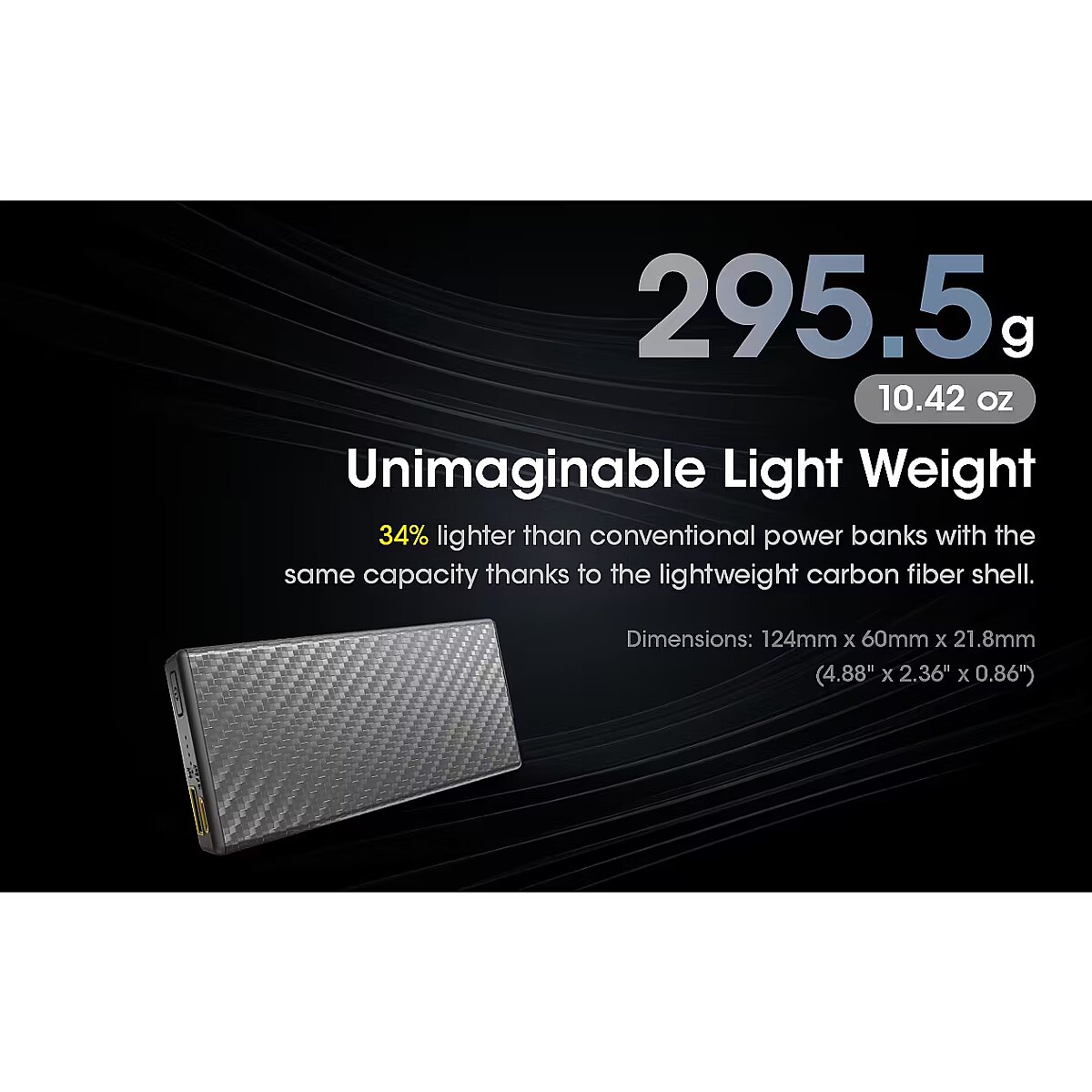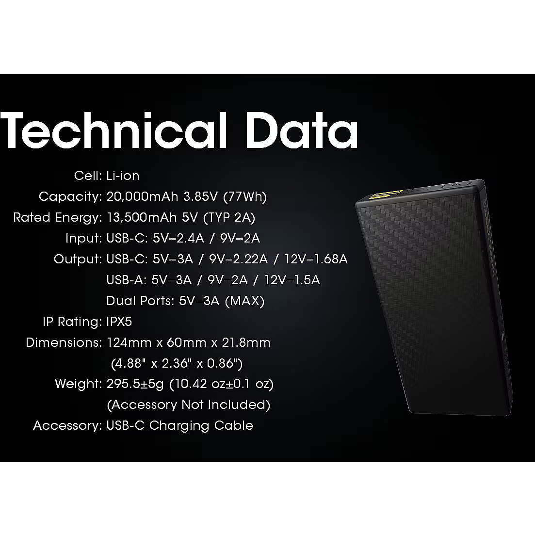 Description - CARBO 20000 Technical Data Cell: Li-ion Capacity: 20,000mAh 3.85V (77Wh) Rated Energy: 13,500mAh 5V (TYP 2A) Input: USB-C: 5V⎓2.4A / 9V⎓2A Output: USB-C: 5V⎓3A / 9V⎓2.22A / 12V⎓1.68A USB-A: 5V⎓3A / 9V⎓2A / 12V⎓1.5A Dual Ports: 5V⎓3A (MAX) Dimensions: 124mm x 60mm x 21.8mm (4.88" x 2.36" x 0.86") Weight: 295.5g±5g (10.42 oz±0.1 oz) Accessory: USB-C Charging Cable