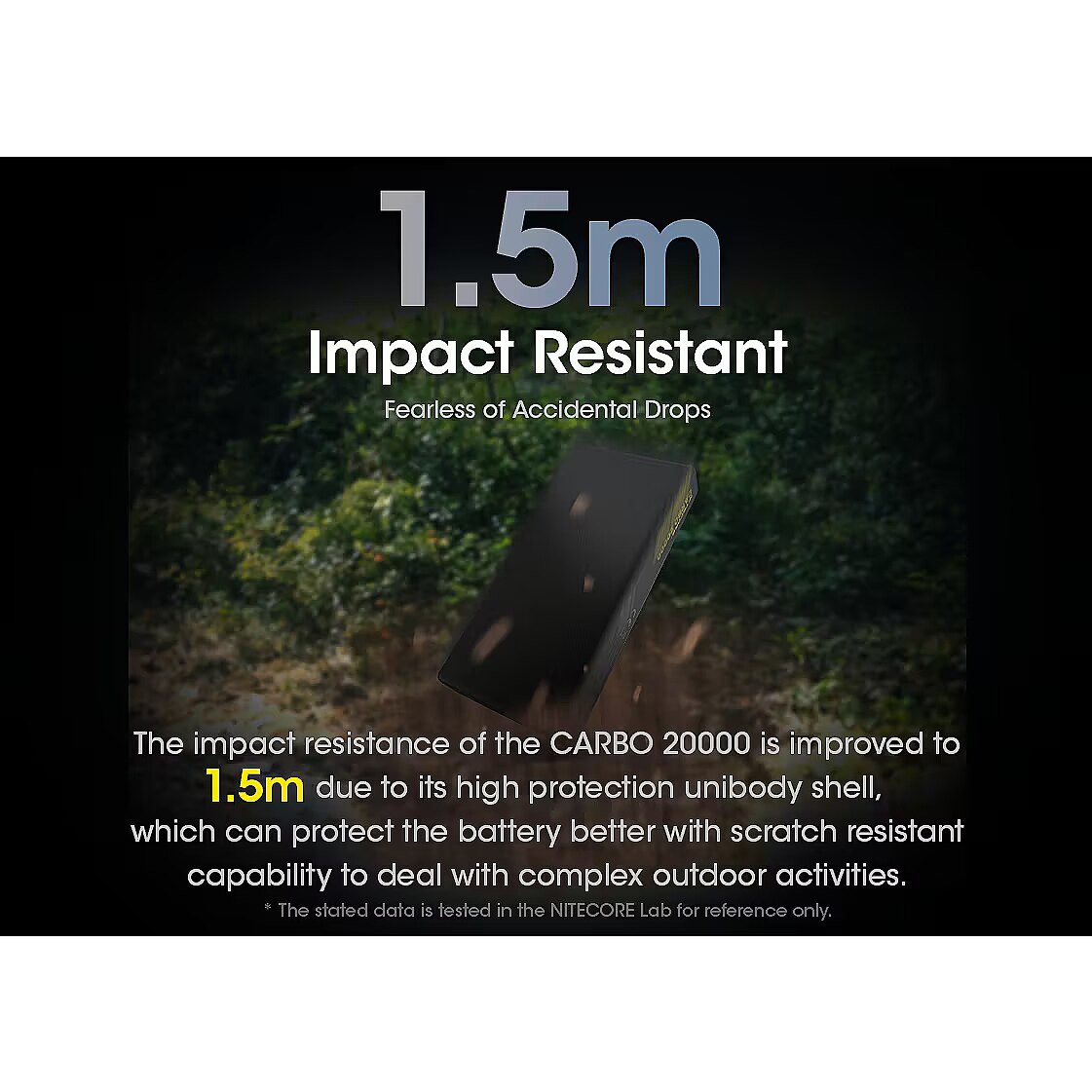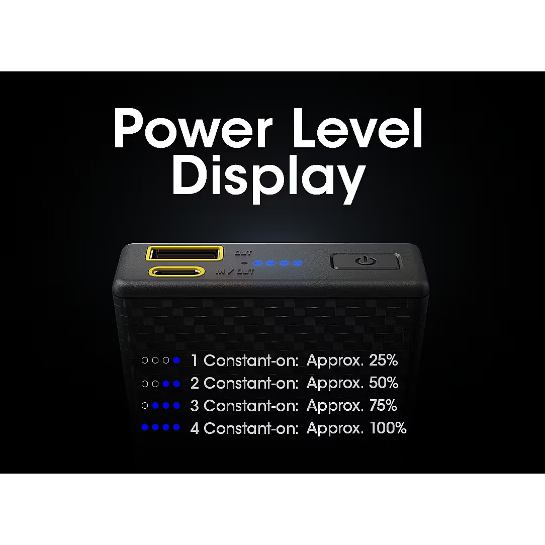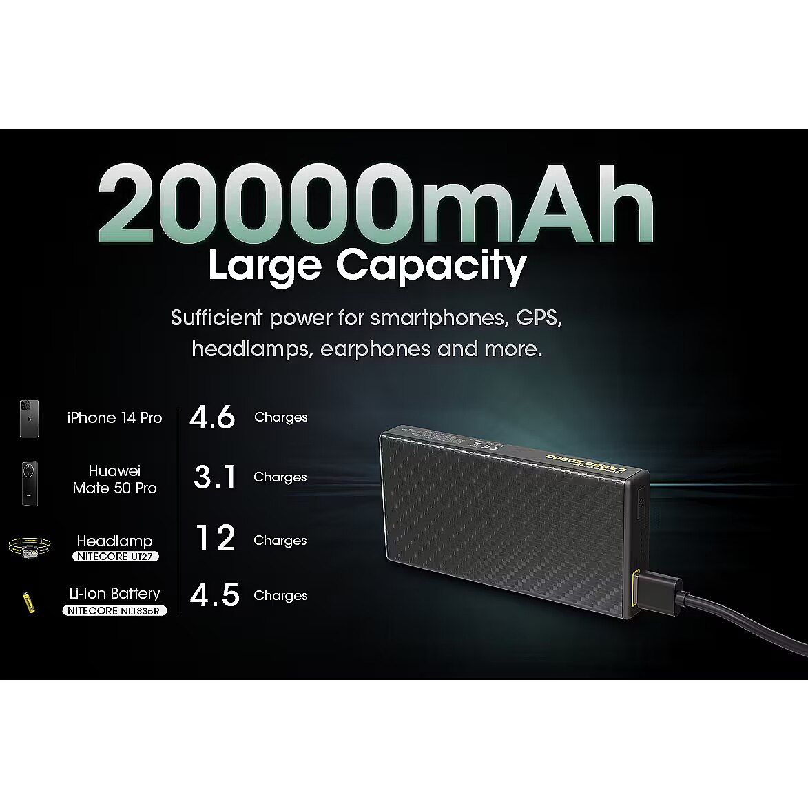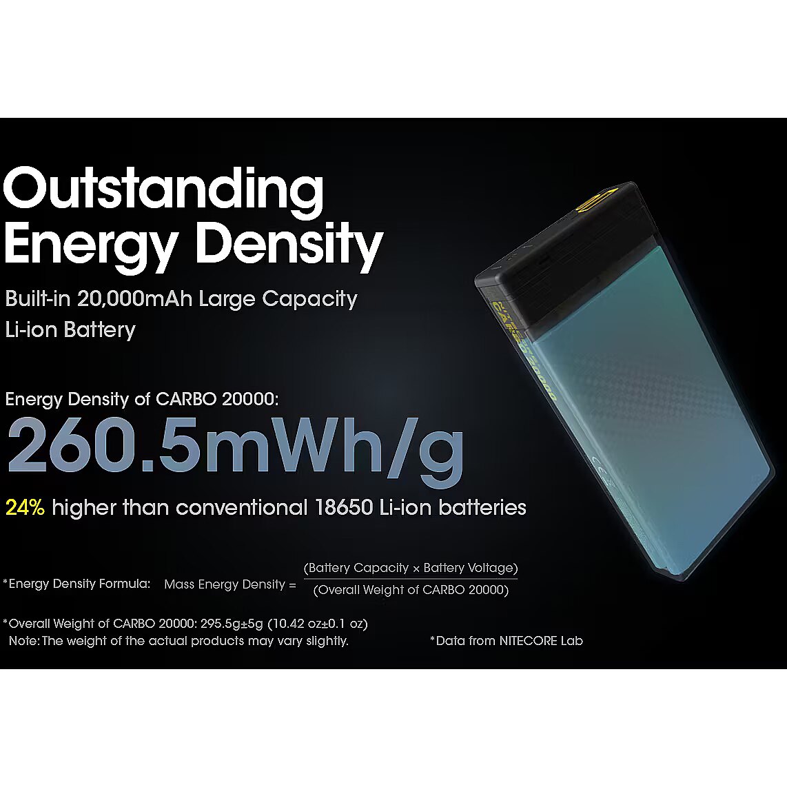 Description - CARBO 20000 Technical Data Cell: Li-ion Capacity: 20,000mAh 3.85V (77Wh) Rated Energy: 13,500mAh 5V (TYP 2A) Input: USB-C: 5V⎓2.4A / 9V⎓2A Output: USB-C: 5V⎓3A / 9V⎓2.22A / 12V⎓1.68A USB-A: 5V⎓3A / 9V⎓2A / 12V⎓1.5A Dual Ports: 5V⎓3A (MAX) Dimensions: 124mm x 60mm x 21.8mm (4.88" x 2.36" x 0.86") Weight: 295.5g±5g (10.42 oz±0.1 oz) Accessory: USB-C Charging Cable