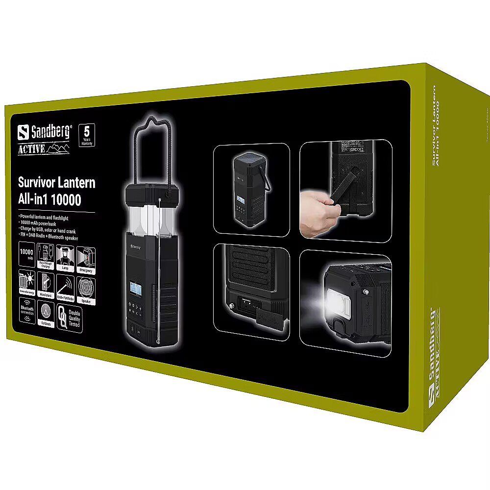 LongDesc - Sandberg Survivor Lantern All-in1 10000 is the perfect companion for camping or a good hike out in the wilds. You get a host of useful functions in one device: Powerful light with adjustable intensity, a powerbank for charging phones etc, a Bluetooth speaker, plus DAB and FM radio. And if the All-in1 Lantern runs out of power when you’re on the move, it can simply be recharged using the integrated solar cell or the crank handle. Built into a robust IPx5 certified shell, for complete reassurance under tough conditions.