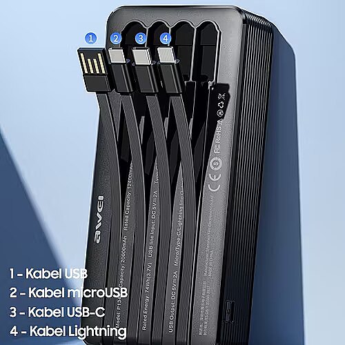 Description - Portable power source This portable power bank is the perfect solution for people who want to have access to electricity outdoors in any situation. Whether you're camping or using solar energy, this power bank will be able to meet your needs. It has a battery with a capacity of 20,000 mAh, which allows you to charge your mobile devices multiple times. This way, you don't have to worry about running out of battery on your smartphone, tablet or other mobile device. LED display It is worth noting the additional functionality of this portable power source, which is the LED display placed on the top of the device. This practical element allows you to keep track of the power bank's battery charge, which is especially important in the case of longer trips or holidays. Thanks to the LED display, which is easy to use, you don't have to worry about the sudden discharge of the device at the least appropriate moment. This practical solution allows you to control the power bank's charge level and properly plan charging, which is especially important when you use many mobile devices on a daily basis. Micro USB, USB-C and Lightning charging ports This portable power bank is equipped with three different charging ports, which means that it can be used with many different devices. It offers a Micro USB port, a USB-C port and a Lightning port, which means it is compatible with most smartphones, tablets, laptops and other mobile devices. The Micro USB port is one of the most popular charging ports on the market and is used in a wide variety of devices. The USB-C port, on the other hand, has become the standard in many modern devices and is considered more future-proof and versatile than Micro USB. The Lightning port is a special port designed by Apple and is used in the company's devices such as the iPhone and iPad. Safety and convenience in one The powerbank is equipped with appropriate surge protection, so you can be sure about the safety of your devices. A portable power source is a perfect solution for people who value comfort and reliability in every situation.