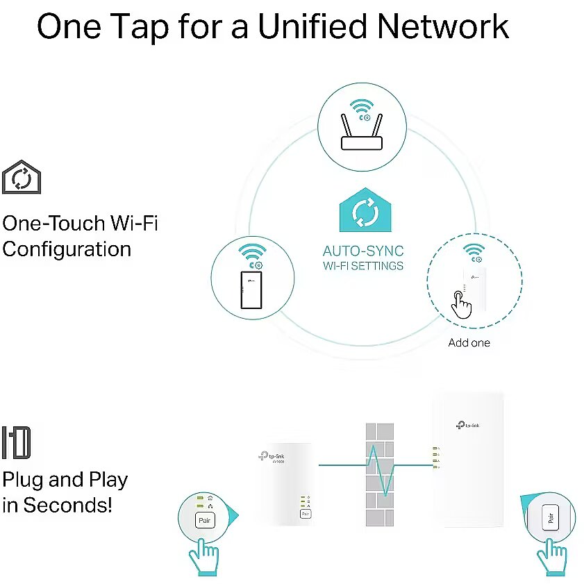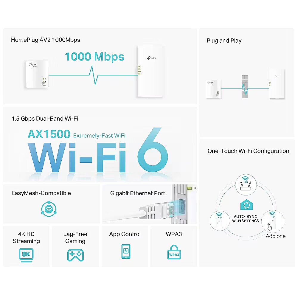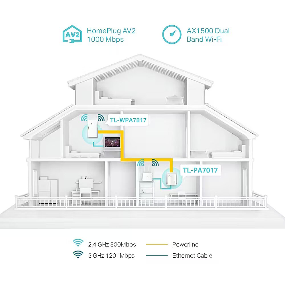 LongDesc - Extend AX1500 Wi-Fi and Gigabit Networking to Every RoomAV1000 Gigabit Powerline AX1500 Wi-Fi 6 KitExtend Wired and Wireless Network Using Electrical SystemTL-WPA7817 KIT transforms your home’s existing electrical circuit into a Gigabit network, and brings wired and wireless network to anywhere there is a power outlet.> No need for drilling or wire installation> Network passes through walls and floors> Expand coverage by adding more extendersOne Tap for a Unified NetworkOne-Touch Wi-Fi ConfigurationInstantly copies your network name and password from your router for easy setup. Automatically applies any setting changes across the network. Your existing Wi-Fi settings will synchronize to the new extender instantly.AV1000 Speeds and 300 Meters RangeUsing advanced HomePlug AV2 technology, TL-WPA7817 KIT ensures stable and high-speed Wi-Fi and wired connection, providing data transmissions of up to 1000 Mbps* over the electrical wiring for ranges up to 300 meters†. Stream in HD, game online and download large files without interruption thanks to reliable powerline links.