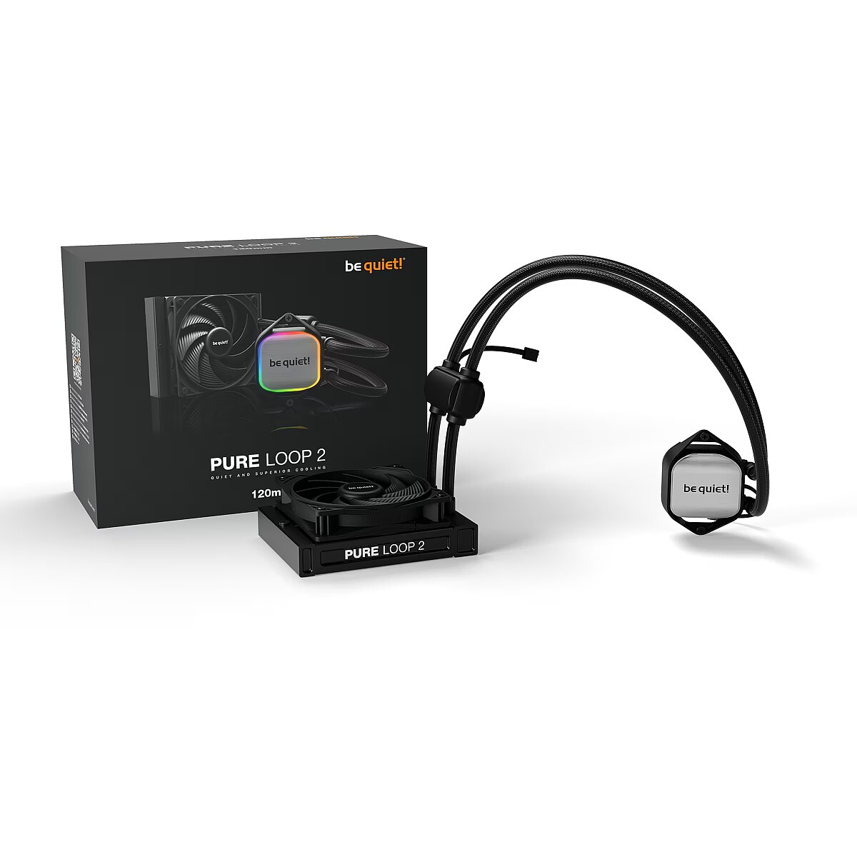 Description - PURE LOOP 2 120mm Quiet and superior cooling Pure Loop 2 120mm is the high-performing and silent All-in-One water cooling unit of be quiet! with elegant ARGB illumination. High cooling performance for all consumer CPUs Pure Wings 3 120mm PWM high-speed fan offers high static pressure with very quiet operation Doubly decoupled PWM pump reduces vibrations to an absolute minimum ARGB illumination on the cooling block, combined with all-black design and aluminum-style for unmistakable and stylish look Easy-to-access refill port and included coolant bottle guarantee a long lifespan Flexible sleeved tubes and a convenient mounting ensure easy handling