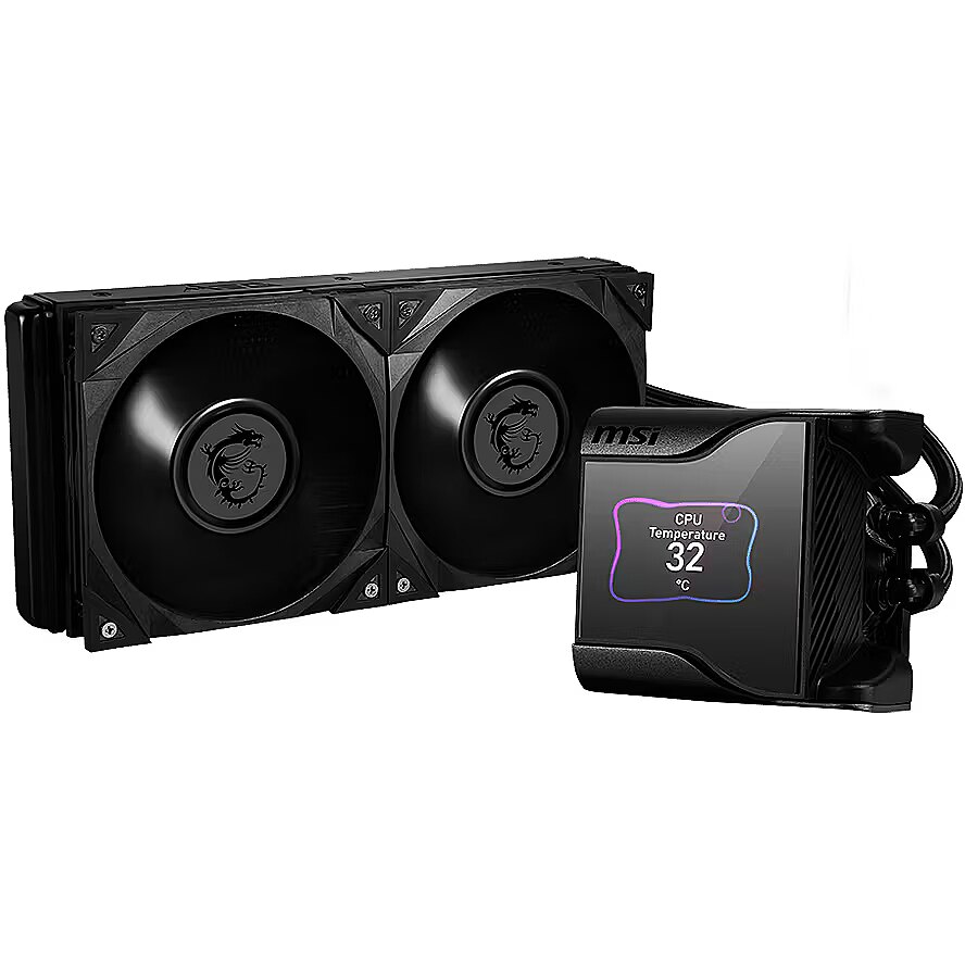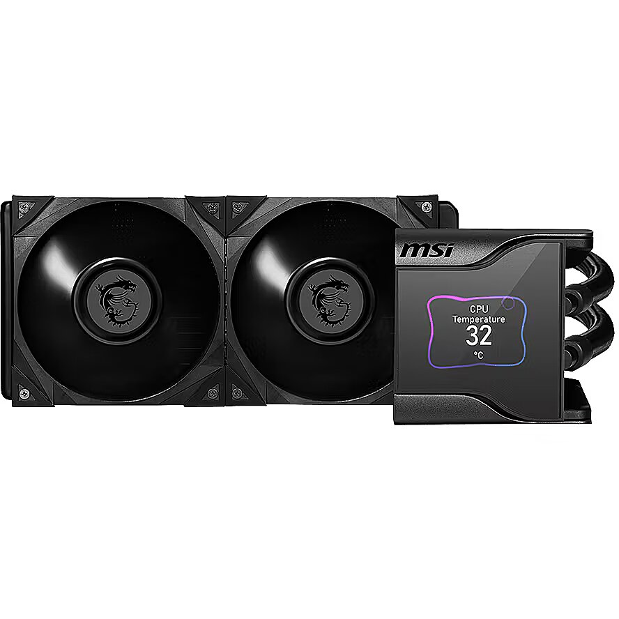 ShortSummaryDescription - MSI MEG CORELIQUID S280 Liquid CPU Cooler '280mm Radiator, 2.4'' IPS Display with fan, 2x 140mm Silent PWM Fan, Center, Supports Intel and AMD Platforms, Latest LGA 1700 ready, Cooled by ASETEK', All-in-one liquid cooler, Black