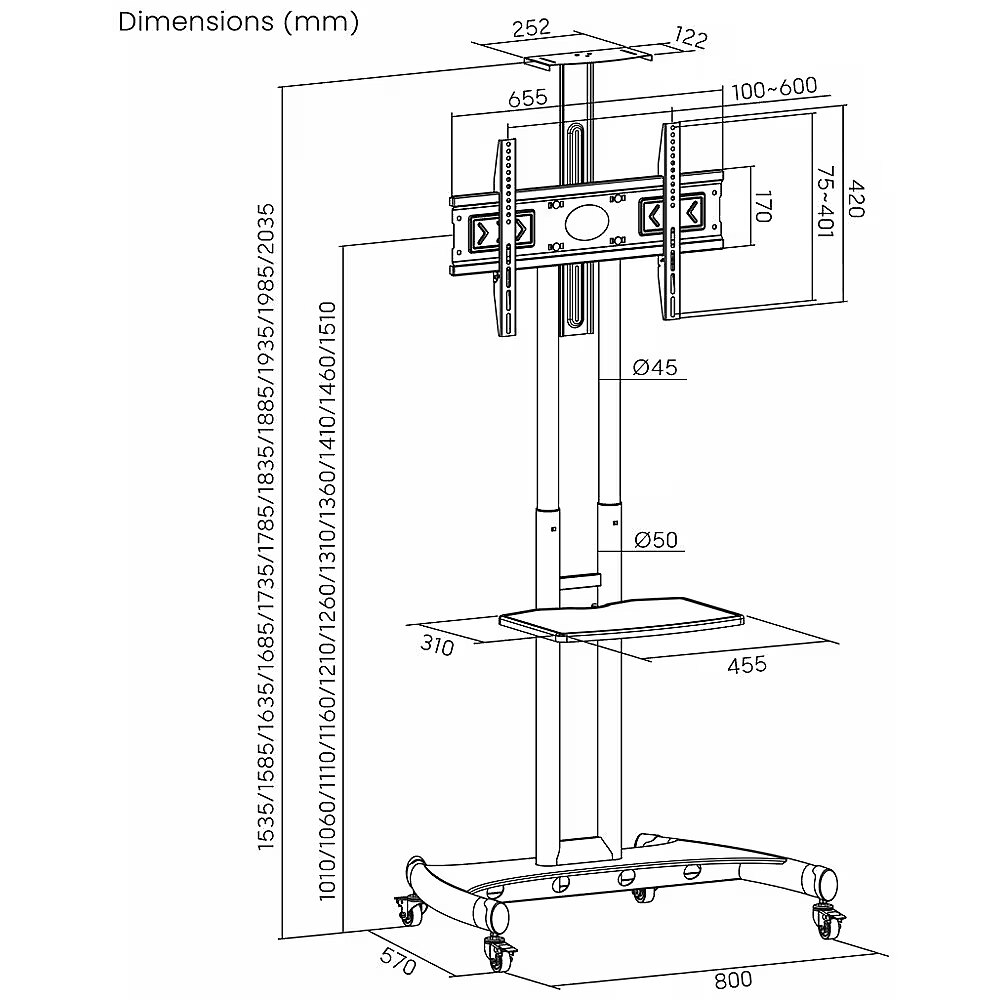Dimensions - Table dimensions (HxDxW) 800x570x2035max Top shelf dimensions 252x122