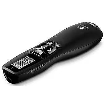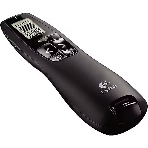 Description - You’ll have powerful control for high-impact presentations with this wireless presenter. Brilliant red laser* pointer Your audience will see exactly where you point. LCD display Keep track of time, battery, and wireless reception with a glance or with silent, vibrating alerts. You remain focused on your presentation, not the clock. Up to 100-foot (30-meter) range You’ll enjoy the freedom to move around the room and mingle with your audience for greater impact. A reception-level indicator ensures you don’t wander too far. Intuitive slideshow controls Buttons are easy to find by touch. And the smooth contours feel great in your hand. You’ll be in control from the first slide to the last. Plug-and-play wireless receiver There’s no software to install. Just plug the receiver into a USB port to begin. And when the show is over, you can store the receiver in the presenter.