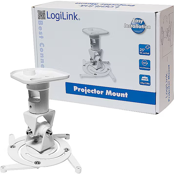 Technical details > Other features - Suitable for projectors up to 15 kg Sturdy and simple design Die-cast aluminum construction Suitable for flat ceilings 25° inclinable and swiveled up to 360° For projectors with a range from 18-31 cm in diameter Adjustable metal arms Mounting hardware included Cable-mounting channel Color: White. The LogiLink projector mount is made of an aluminum alloy die-cast construction and holds projectors of up to 15 kg via a screw connection with a range from 18-31 cm in diameter. The cable-mounting channel ensures order. The mount can be tilt up to 25° and can be swiveled up to 360°. It is suitable for flat ceilings and is supplied with the necessary installation material for an easy installation.