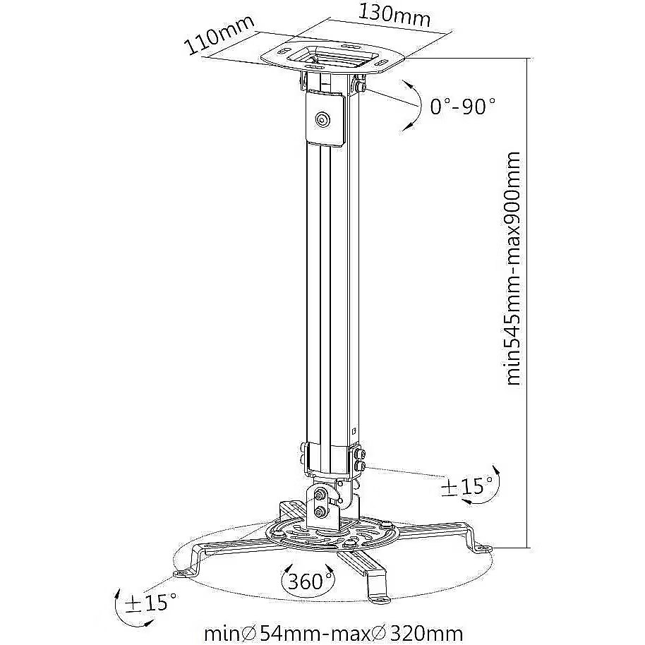 ShortSummaryDescription - Techly Projector Ceiling Support Extension 545-900 mm Silver ICA-PM 18M, Ceiling, 13.5 kg, Silver, 545 - 900 mm, -15 - 15°, 360°