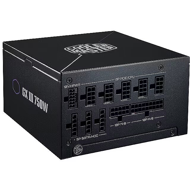 Available for purchase is a power supply produced by Cooler Master with a power output of 750W. The product has been awarded an 80 PLUS Gold energy efficiency certificate.