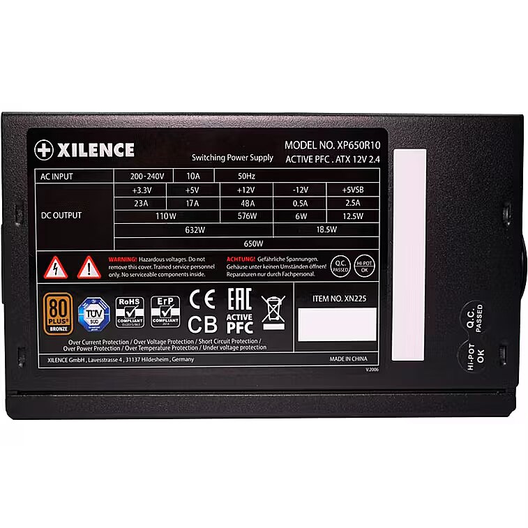This Xilence brand power supply unit has an 80 PLUS Bronze energy efficiency certificate and a power output of 650W.