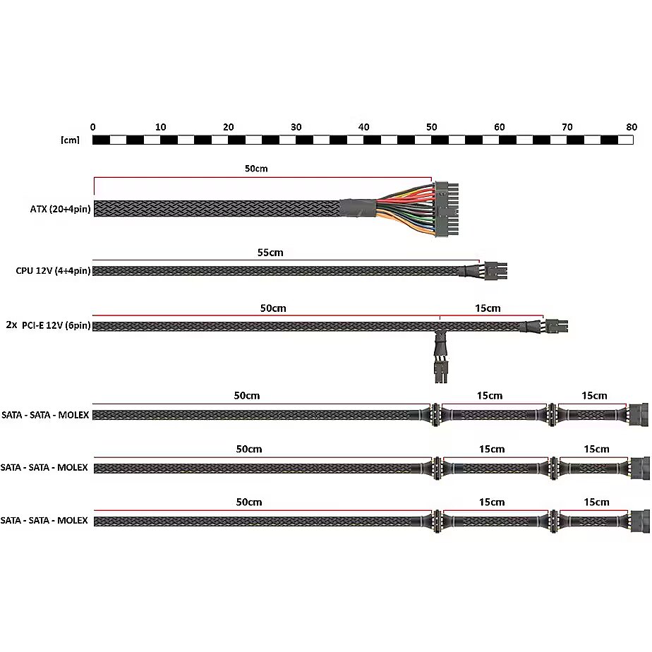 This power supply unit has been assigned the ATX 2.0 standard. This means that the unit is equipped only with 6-pin and 8-pin connectors, providing 75W and 150W power respectively. It's important to note that this unit will be compatible with RTX 4070 and more powerful cards, but you will need to use the 2x8-pin to 16-pin 12VHPWR adapter included with the graphics card. ATX 2.0 power connectors are not designed to handle the high power fluctuations of modern graphics cards; therefore, if you are building a system with a powerful GPU, such as the RTX 4070, we recommend choosing a power supply unit with the ATX 3.* standard and 12VHPWR (PCIe 5.0) connector.