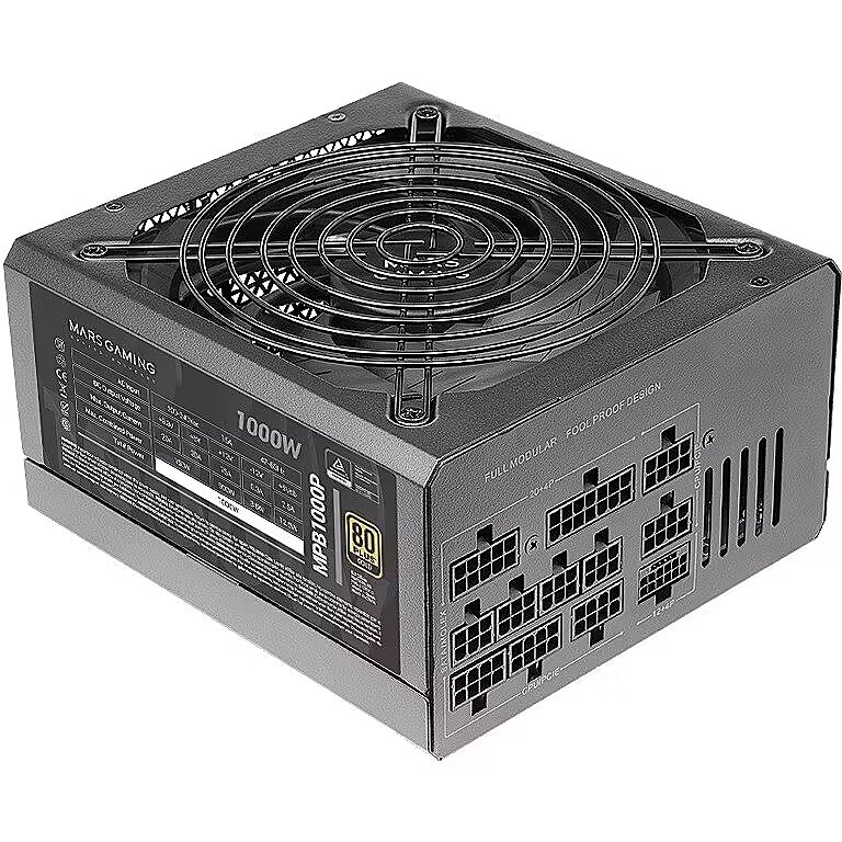LongSummaryDescription - Mars Gaming MPB1000P. Total power: 1000 W, AC input voltage: 200 - 240 V, AC input frequency: 47 - 63 Hz. Motherboard power connector: 24-pin ATX, Cabling type: Fully-Modular. Purpose: PC, Power supply unit (PSU) form factor: ATX, 80 PLUS certification: 80 PLUS Gold. Product colour: Black, Cooling type: Active, Fan diameter: 14 cm. Certification: ATX12V