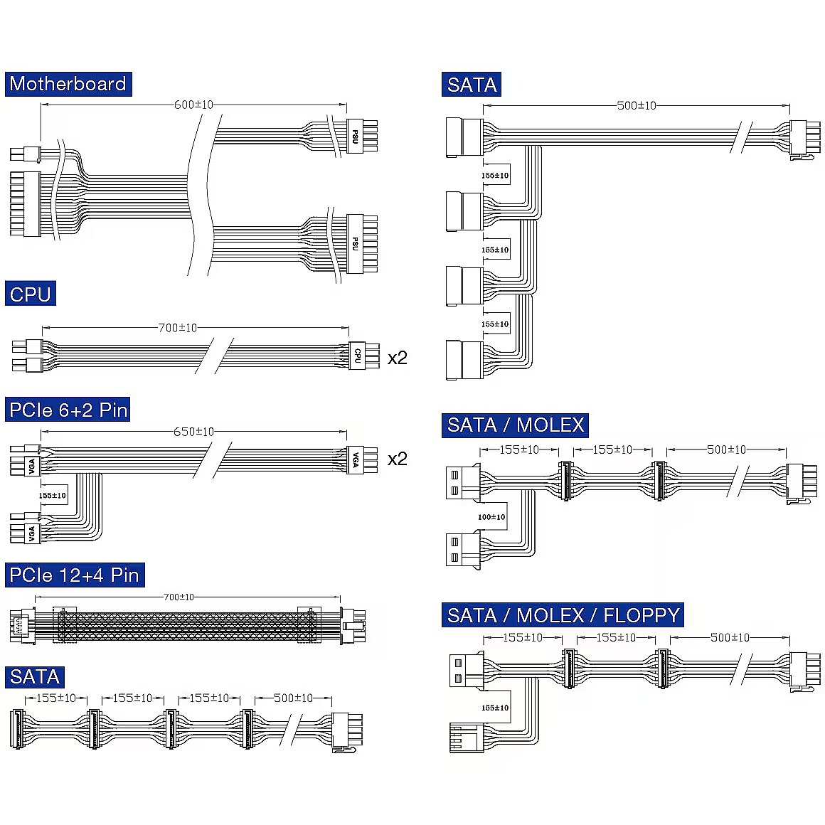 Packaging content - Cables included - CPU, PCIe, Peripheral (Molex), SATA