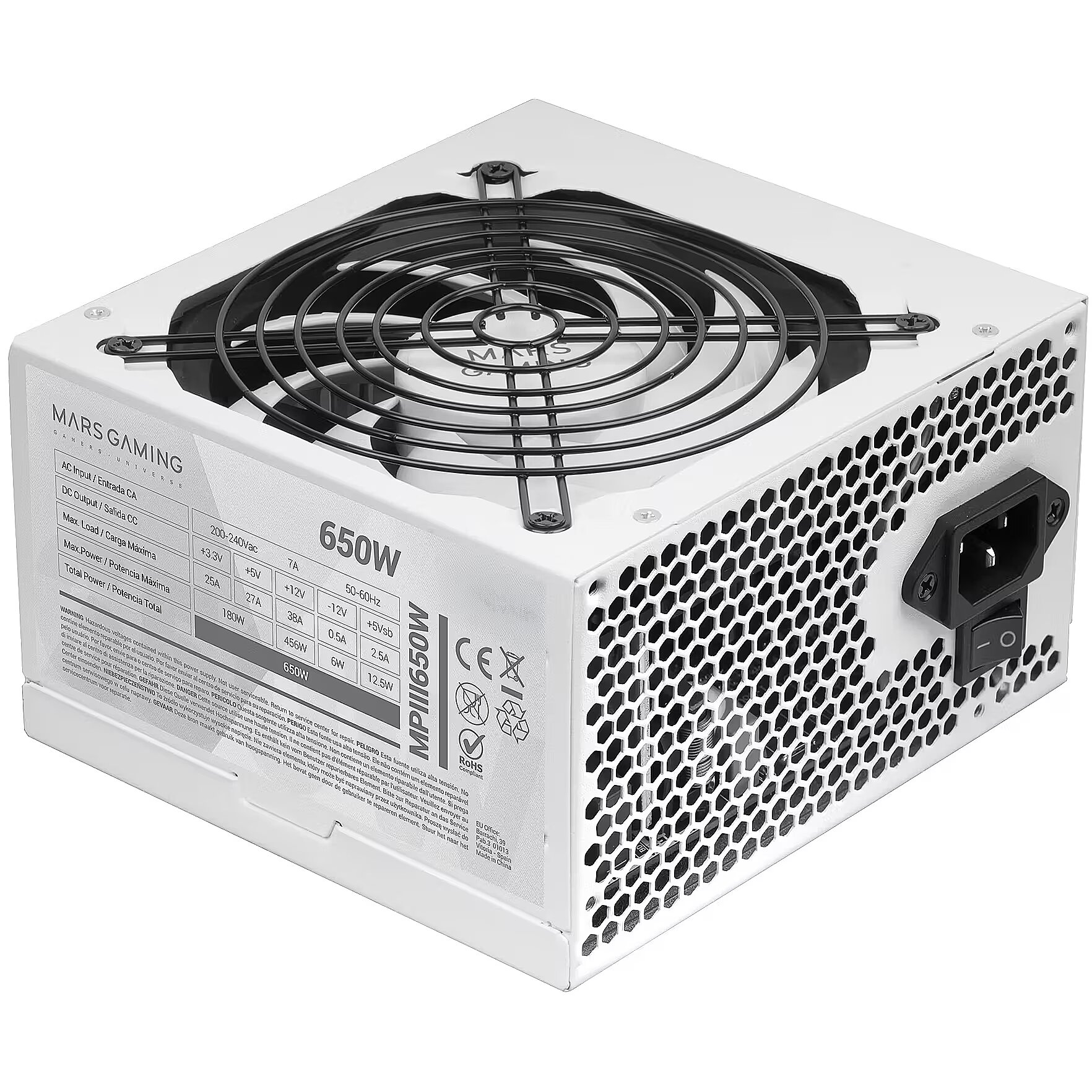 LongSummaryDescription - Mars Gaming MPIII650. Total power: 650 W, AC input voltage: 200 - 240 V, AC input frequency: 50/60 Hz. Motherboard power connector: 20+4 pin ATX, Cabling type: Non-Modular. Purpose: PC, Power supply unit (PSU) form factor: ATX, Noise level: 14 dB. Product colour: White, Cooling type: Active, Fan diameter: 12 cm. Compliance certificates: CE, RoHS