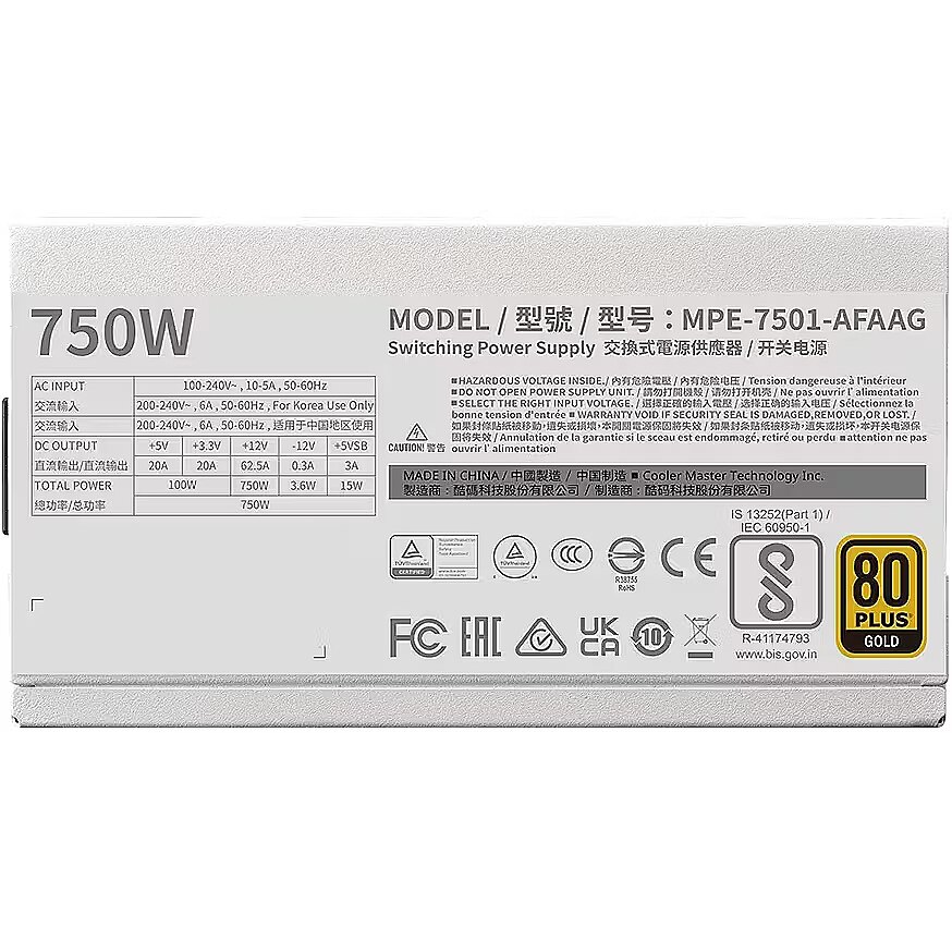 We offer to purchase a Cooler Master power supply unit with a power capacity of 750W, which has received the 80 PLUS Gold energy efficiency certification.