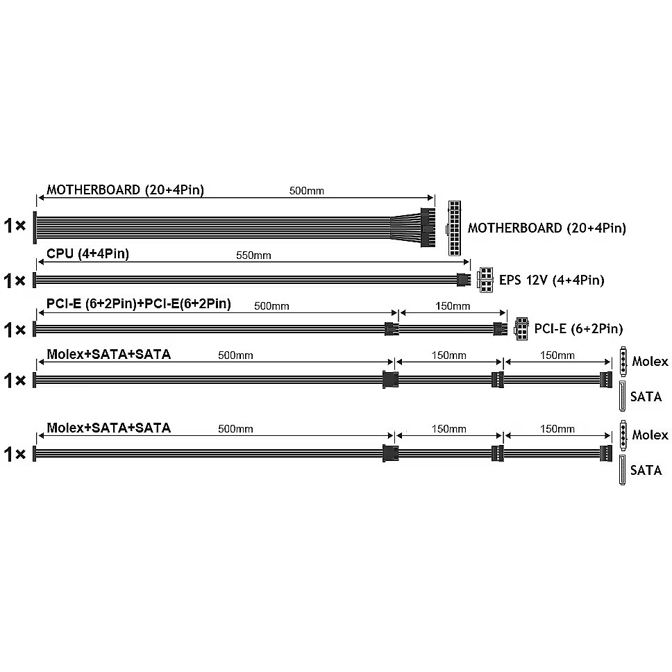 This power supply unit has been assigned the ATX 2.0 standard. This means that the unit is equipped only with 6-pin and 8-pin connectors, providing 75W and 150W power respectively. It's important to note that this unit will be compatible with RTX 4070 and more powerful cards, but you will need to use the 2x8-pin to 16-pin 12VHPWR adapter included with the graphics card. ATX 2.0 power connectors are not designed to handle the high power fluctuations of modern graphics cards; therefore, if you are building a system with a powerful GPU, such as the RTX 4070, we recommend choosing a power supply unit with the ATX 3.* standard and 12VHPWR (PCIe 5.0) connector.