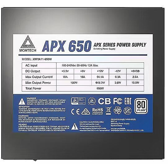 Summary - Montech APX650. Total power: 650 W, AC input voltage: 100 - 240 V, AC input frequency: 50/60 Hz. Motherboard power connector: 20+4 pin ATX. Purpose: PC, Power supply unit (PSU) form factor: ATX, 80 PLUS certification: 80 PLUS White. Product colour: Black, Fan diameter: 12 cm, Number of fans: 1 fan(s). Compliance certificates: CB, CE, EAC, Federal Communications Commission (FCC), RCM, RoHS, UKCA, cTUVus