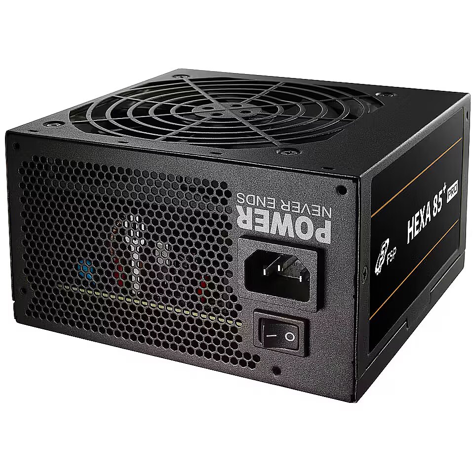 LongSummaryDescription - FSP HEXA 85+ PRO. Total power: 550 W, AC input voltage: 100 - 240 V, AC input frequency: 50 - 60 Hz. Motherboard power connector: 24-pin ATX, Cabling type: Non-Modular. Purpose: PC/Server, Power supply unit (PSU) form factor: ATX, 80 PLUS certification: 80 PLUS Bronze. Product colour: Black, Cooling type: Active, Fan diameter: 12 cm. Cables included: CPU, PCIe, Peripheral (Molex), SATA