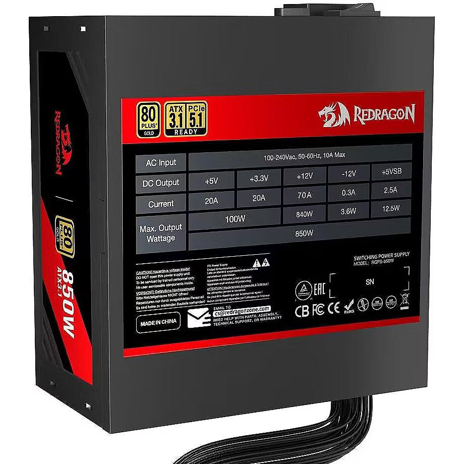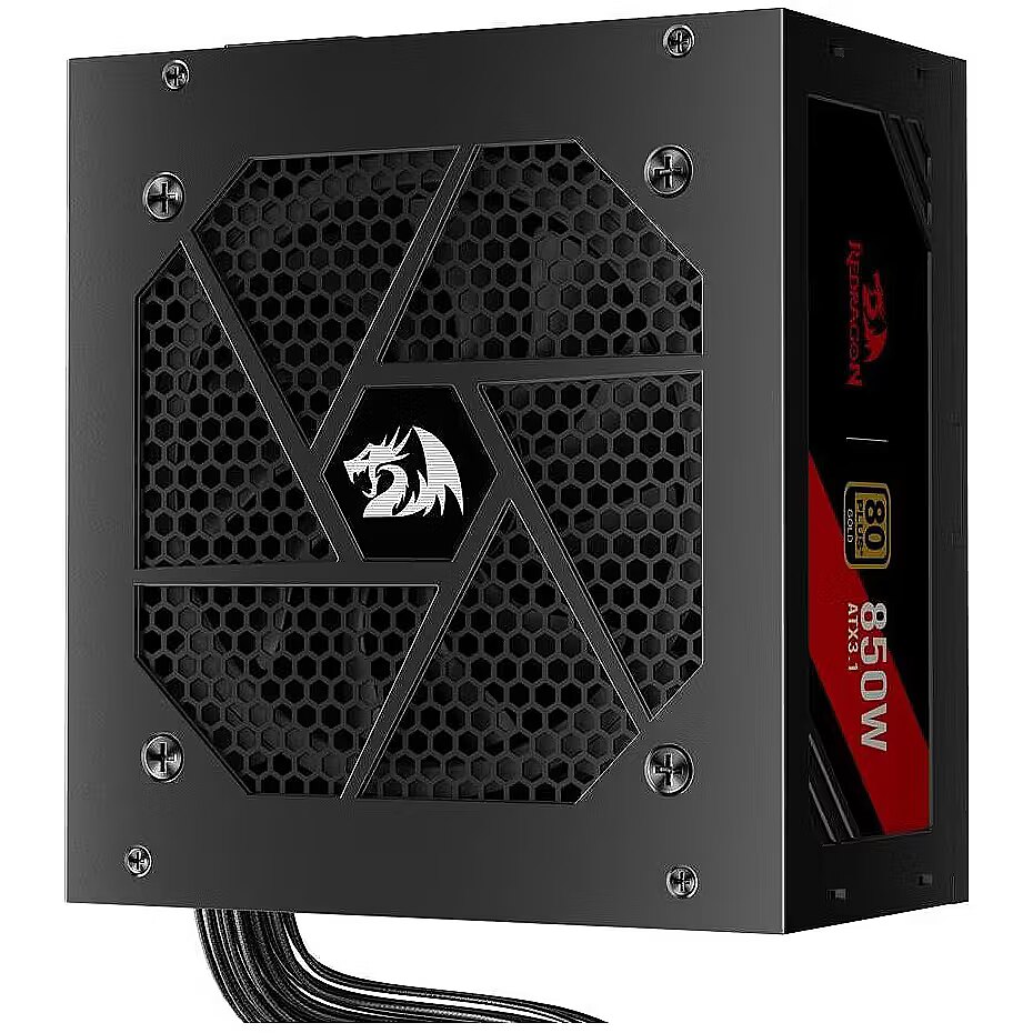 This Redragon brand power supply unit has an 80 PLUS Gold energy efficiency certificate and a power output of 850W.