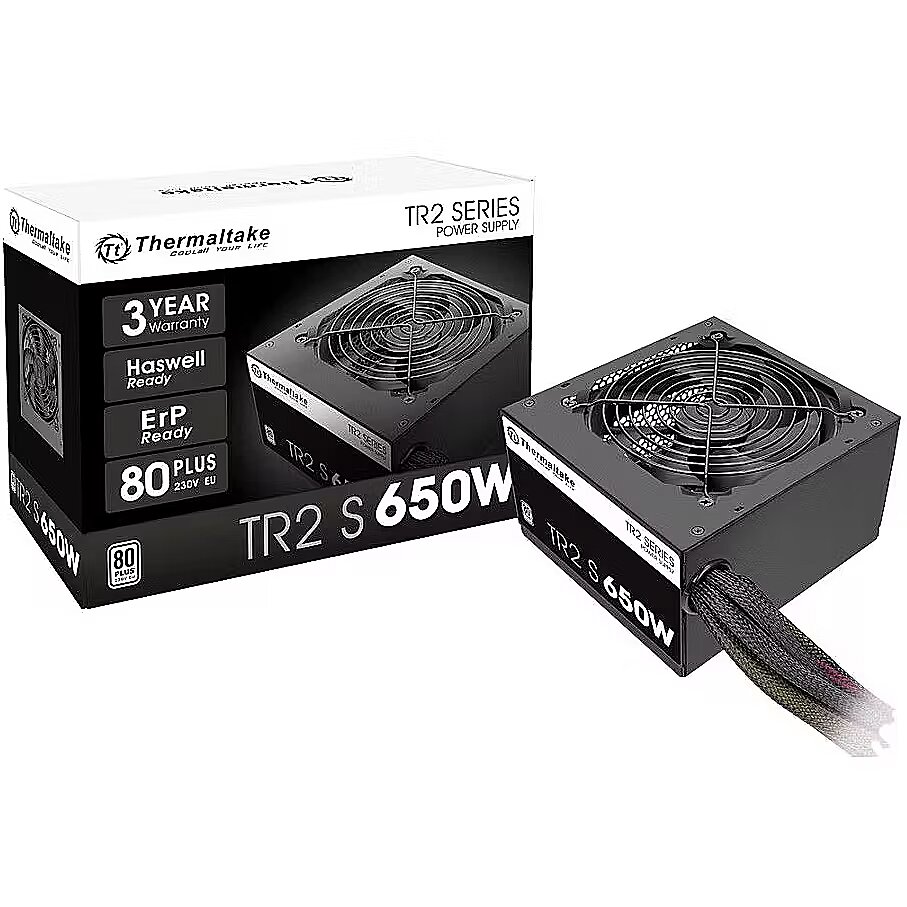 Available for purchase is a power supply produced by Thermaltake with a power output of 650W. The product has been awarded an 80 PLUS (White) energy efficiency certificate.