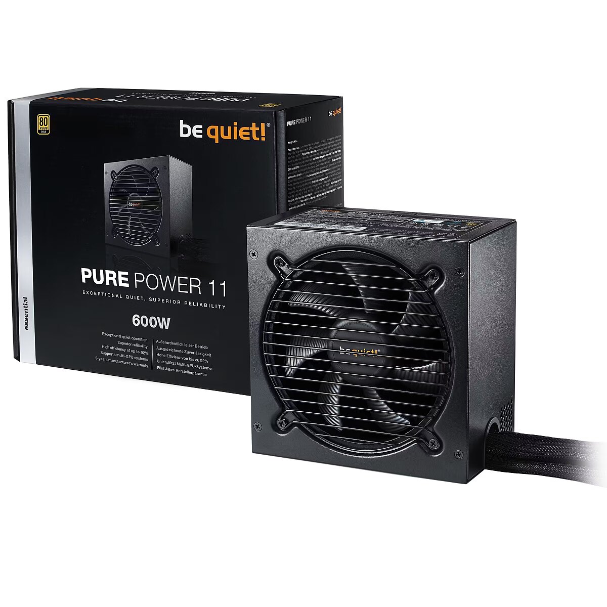 LongDesc - Exceptionally Quiet, Superior Reliability, Great ValuePure Power 11 600W offers peerless dependability and best-in-class features. Whether you’re assembling a very quiet system, building a multi-GPU gaming system, or upgrading an existing PC, your build will benefit from this PSU that simply has the best combination of features at a very popular price.80 PLUS® GOLD CERTIFICATIONVery high operating efficiencyPure Power 11 600W is certified 80 PLUS Gold with an efficiency rating of up to 92% – a truly outstanding level for this class of PSU. The most compelling benefit: lower power consumption and consequently lower costs, and cooler, quieter operation.POWER AND COMPATIBILITY FOR YOUR SYSTEMThe best combination of features and performance at a very popular pricePure Power 11 offers 600W of continuous power with 2 independent 12V rails for signal stability and 4 PCI express connectors for multi-GPU systems. It is suited to very quiet systems, for upgrading or building multimedia or multi-GPU gaming systems.INNOVATIVE TECHNOLOGIESDC-to-DC, Active Clamp and Synchronous RectifierThe use of Active Clamp and Synchronous Rectifier technologies provides very stable operation. The PSU is equipped with DC-to-DC conversion for even tighter voltage regulation under heavy cross-loading conditions. This ensures secure operation for next generation processors and graphics cards.EXCEPTIONALLY SILENT OPERATIONAchieved by a silence-optimized 120mm be quiet! fanThe silence-optimized 120mm be quiet! fan is thermally governed to strike the best balance between effective cooling and quietness. Airflow-optimized fan blades reduce turbulence, enabling best-in-class quiet functionality and the almost inaudible operation that be quiet! is famous for.HIGH-QUALITY SLEEVED CABLESKeeping your system tidy and good-lookingPure Power 600W is equipped with high-quality sleeved cables that simplify component installation, increase airflow and improve cooling. The All-in-one cable has a convenient easy-plug HDD connector.