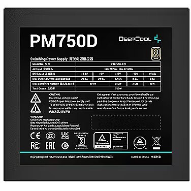 Technical_details - PM750D 750W, PC power supply The non-modular PC power supply DeepCool PM750D 750W from the PM-D series is certified with 80 PLUS Gold and offers an efficient power supply with high performance. All of this is available at an affordable price. For solid performance and minimal signal noise, the PM-D series power supplies feature a full-bridge LLC topology with DC-DC conversion that offers excellent reliability. Each PM-D power supply meets modern design standards for consistent voltage stability and also conforms to Intel's PSU guidelines, allowing for instant power-up from hibernation or standby. Type: PC power supply Color: Black EAN code: 6933412709510 Manufacturer part number: R-PM750D-FA0B-EU Series: PM-D Performance: Total | 750W Power: +12V total | 750W Power: +3.3V/+5V total | 110W Performance: Efficiency | up to 90% Performance: input voltage range | 100-240 volts Default: ATX12V 2.4 Design: ATX Certification: 80 PLUS Gold Amperages: +3.3 V | 20A Amperages: +5 V | 20A Currents: +5 Vsb | 3 A Amperages: -12 V | 0.3A Amperages: +12 V total | 62.5A Amperages: +12 V1 | 62.5A Power Factor Correction: Active PFC Switch: 1x power switch Connectors: 1x 24-pin ATX12V-2.x, 2x 4+4-pin 12V, 3x 4-pin 5.25", 3x 6+2-pin graphics, 6x 15-pin SATA Cooling: number of fans | 1x 120mm fan Cooling: Regulation | Temperature controlled Protections: Over Current Protection (OCP), Over Voltage Protection (OVP), Overload Protection (OLP/OPP), Short Circuit Protection (SCP), Over Temperature Protection (OTP) Dimensions: Width: 150mm x Height: 86mm x Depth/Length: 140mm