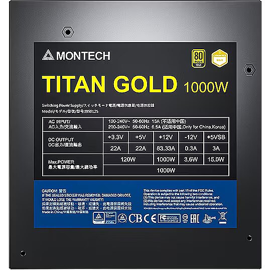 This Montech brand power supply unit has an 80 PLUS Gold energy efficiency certificate and a power output of 1000W.