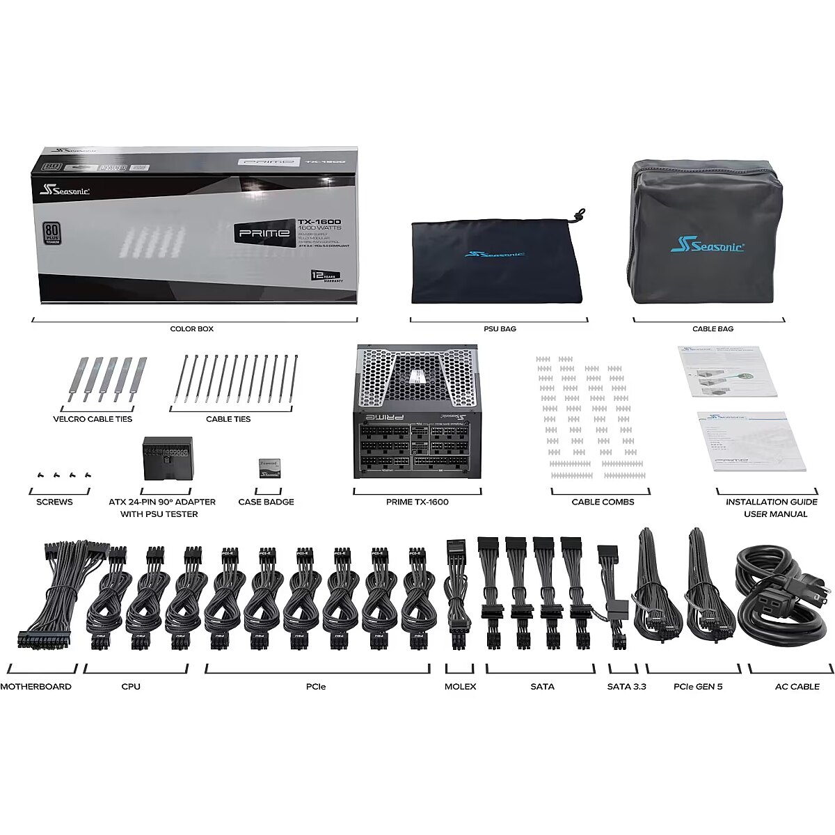 Description - SEASONIC PRIME TX ATX 3.0 1600 W Unrivaled Power and Efficiency The Seasonic PRIME TX ATX 3.0 1600 W power supply sets a new standard in power delivery with its unmatched efficiency and reliability. Built upon the acclaimed PRIME TX platform, this power supply incorporates the latest ATX 3.0 and PCIe 5.0 standards, ensuring compatibility with cutting-edge hardware. This makes it an ideal choice for gamers, content creators, and professionals seeking unparalleled performance. ATX 3.0 and PCIe 5.0 Compatibility Designed to meet the demands of the latest hardware, the PRIME TX ATX 3.0 1600 W supports ATX 3.0 and PCIe 5.0, making it future-proof. It is equipped with native 12VHPWR connectors, ensuring seamless connectivity with next-generation graphics cards and processors. This feature guarantees that users can fully leverage the power of the latest GPUs without any compatibility issues. Exceptional Power Delivery With a massive 1600 W power output, this unit ensures your system runs smoothly even under the most demanding conditions. Whether you’re running multiple GPUs, overclocking your CPU, or engaging in resource-intensive applications, the PRIME TX ATX 3.0 provides consistent and reliable power delivery, preventing any performance dips or hardware instability. Superior Build Quality Seasonic has a reputation for exceptional build quality, and the PRIME TX ATX 3.0 1600 W is no exception. It features 105°C-rated Japanese electrolytic capacitors, which are known for their longevity and stability. These high-quality components ensure long-term durability and consistent performance, even under heavy loads and high temperatures. Digital Fan Control and Silent Operation The power supply is equipped with advanced Digital Fan Control, allowing for optimal cooling while maintaining a near-silent operation. The fan adjusts its speed based on the load, ensuring efficient heat dissipation without generating excessive noise. This makes the PRIME TX ATX 3.0 perfect for users who require a quiet computing environment. Energy Efficiency and Eco-Friendly The PRIME TX ATX 3.0 1600 W is 80 PLUS Titanium certified, boasting an efficiency rating of over 94%. This high efficiency translates to lower energy consumption, reduced heat output, and significant savings on electricity bills. Additionally, its eco-friendly design aligns with Seasonic's commitment to sustainability, making it an environmentally responsible choice. Comprehensive Protection Features Safety is a top priority for Seasonic, and the PRIME TX ATX 3.0 includes a comprehensive suite of protection features. These include Over Voltage Protection (OVP), Under Voltage Protection (UVP), Over Power Protection (OPP), Short Circuit Protection (SCP), and Over Temperature Protection (OTP). These safeguards protect your system components from damage caused by power irregularities, ensuring peace of mind for users. Easy Installation and Modular Design The fully modular design of the PRIME TX ATX 3.0 1600 W simplifies cable management and installation. Users can connect only the cables they need, reducing clutter and improving airflow within the case. The high-quality cables are also designed to be flexible and durable, further enhancing the overall user experience. Unmatched Warranty and Support Seasonic stands behind the PRIME TX ATX 3.0 1600 W with an impressive 12-year warranty, reflecting their confidence in the product's durability and performance. This extensive warranty provides users with long-term assurance and reliable support, ensuring their investment is well-protected. Perfect for High-End Systems Whether you are building a high-performance gaming rig, a professional workstation, or a content creation powerhouse, the PRIME TX ATX 3.0 1600 W is the ideal power supply to meet your needs. Its robust power output, advanced features, and superior build quality make it a top choice for enthusiasts and professionals alike. In conclusion, the Seasonic PRIME TX ATX 3.0 1600 W power supply offers exceptional performance, efficiency, and reliability. With its ATX 3.0 and PCIe 5.0 compatibility, high-quality components, and advanced features, it is designed to handle the most demanding applications and ensure a seamless computing experience.