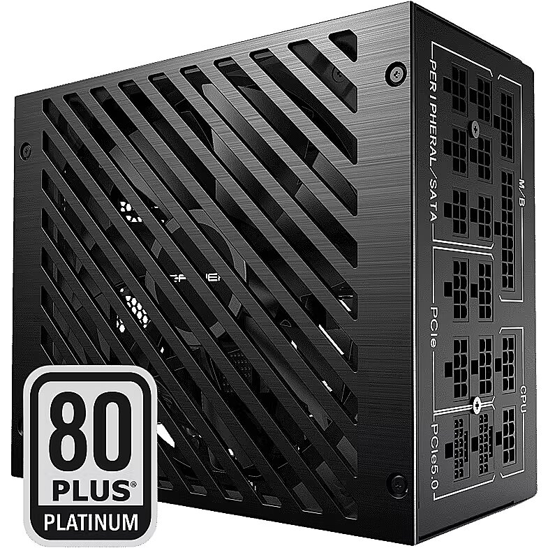 The power supply has been awarded the 80 PLUS Platinum energy efficiency certificate, which ensures at least 92% efficiency at 50% load. This indicates that at least 92 W out of 100 W of power that the power supply receives from the power grid is delivered to the computer components, while the remaining 8 W is lost as heat.