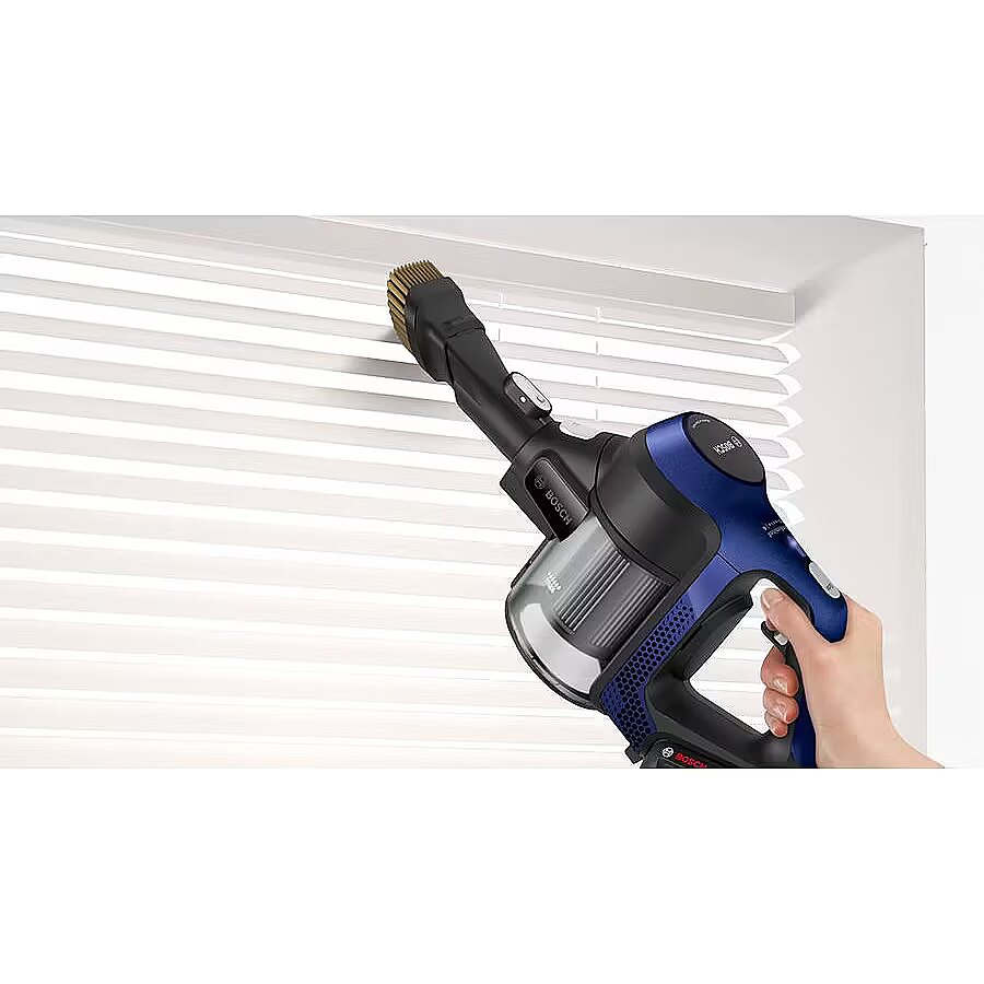 LongSummaryDescription - Bosch Serie 6 BBS611MAT. Product type: 2-in-1 stick vacuum, Dust container type: Bagless, Product colour: Blue. Cleaning type: Dry, Cleaning surfaces: Bare floor, Carpet, Hard floor, Tile. Power control: Electronic. Power source: Battery, Battery voltage: 18 V, Runtime: 30 min. Width: 252 mm, Depth: 204 mm, Height: 1234 mm