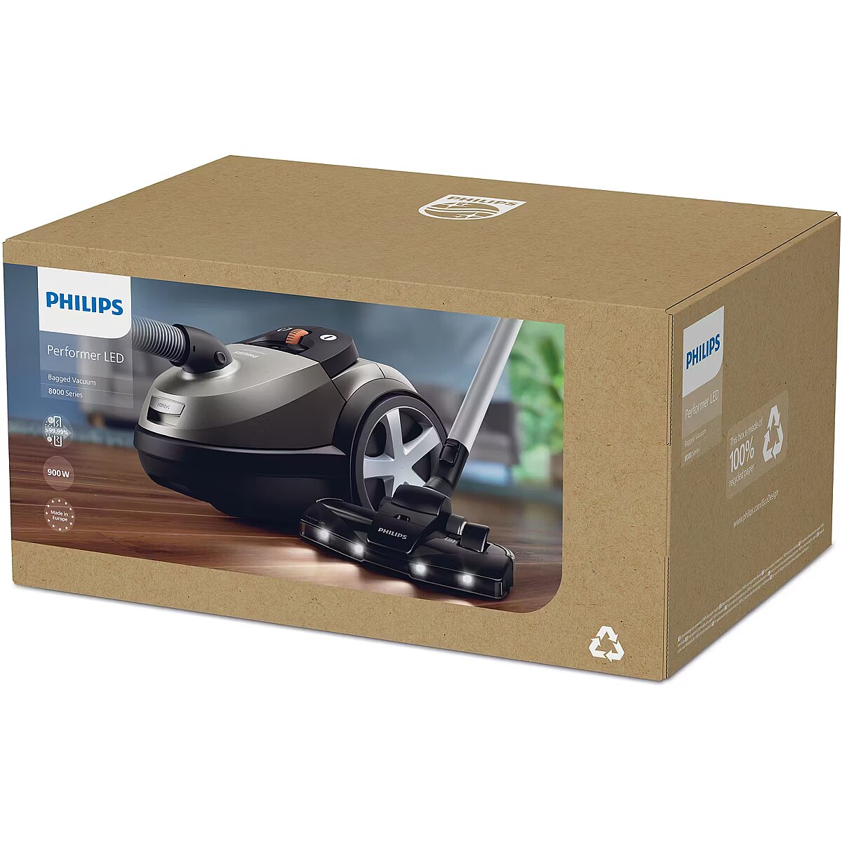 Description - Enjoy incredibly clean floors with the Philips Performer LED 8000 Series vacuum cleaner. The TriActive+LED nozzle brings out fine dust and the powerful 900 W motor removes it quickly. The SuperTurbo brush enables thorough carpet cleaning by removing hair and lint. • 900 W and 99.9% dust removal • SuperTurbo carpet brush • TriActive+LED nozzle • HEPA 13 filtration level