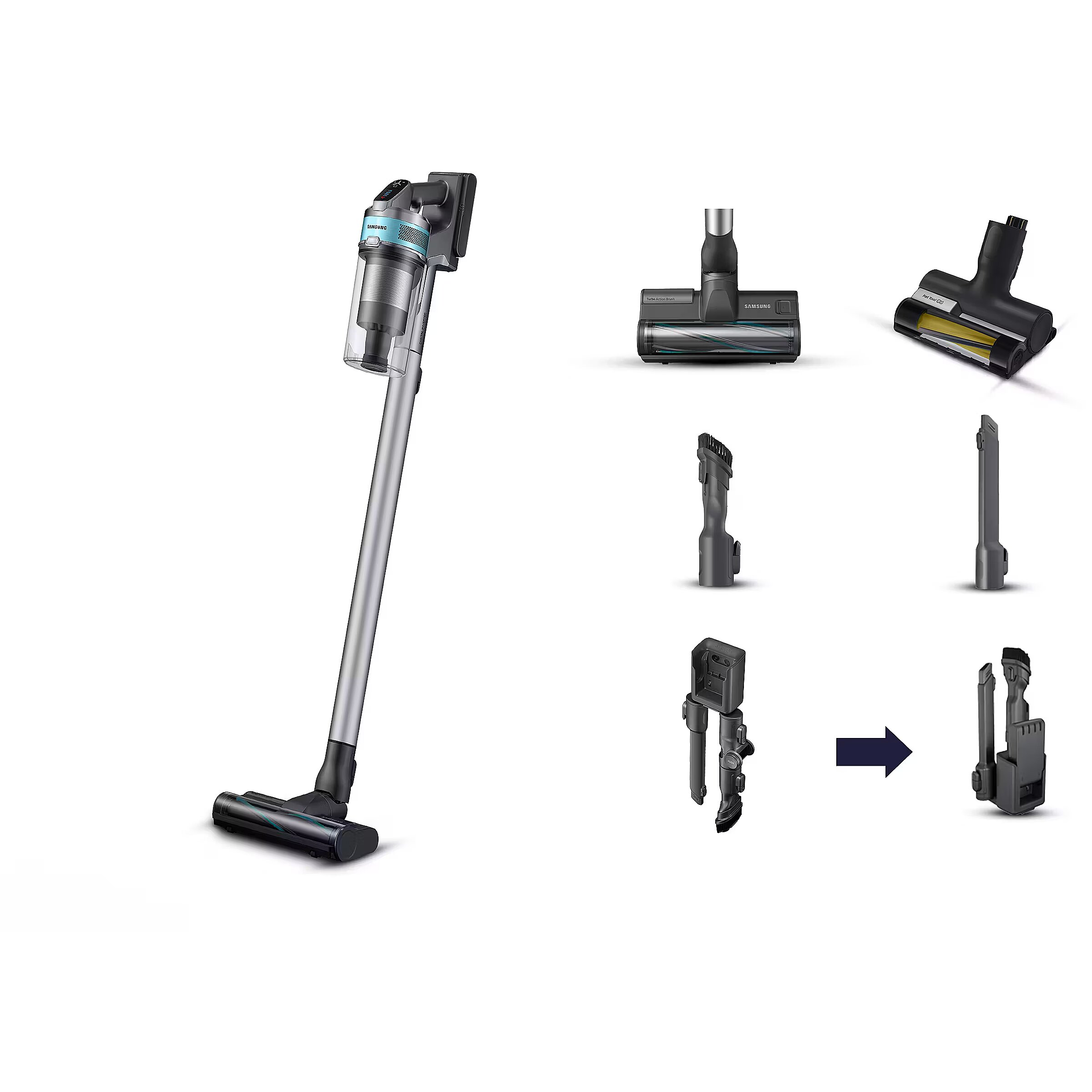 LongSummaryDescription - Samsung VS20B75AGR1. Product type: 2-in-1 stick vacuum, Dust container type: Bagless, Product colour: Black, Mint colour. Cleaning type: Dry, Dirt separating method: Multi cyclonic, Cleaning surfaces: Carpet, Hard floor. Power source: Battery, Maximum input power: 550 W, Motor power: 200 W. Package width: 214 mm, Package depth: 265 mm, Package height: 757 mm. Width: 250 mm, Depth: 215 mm, Height: 1130 mm