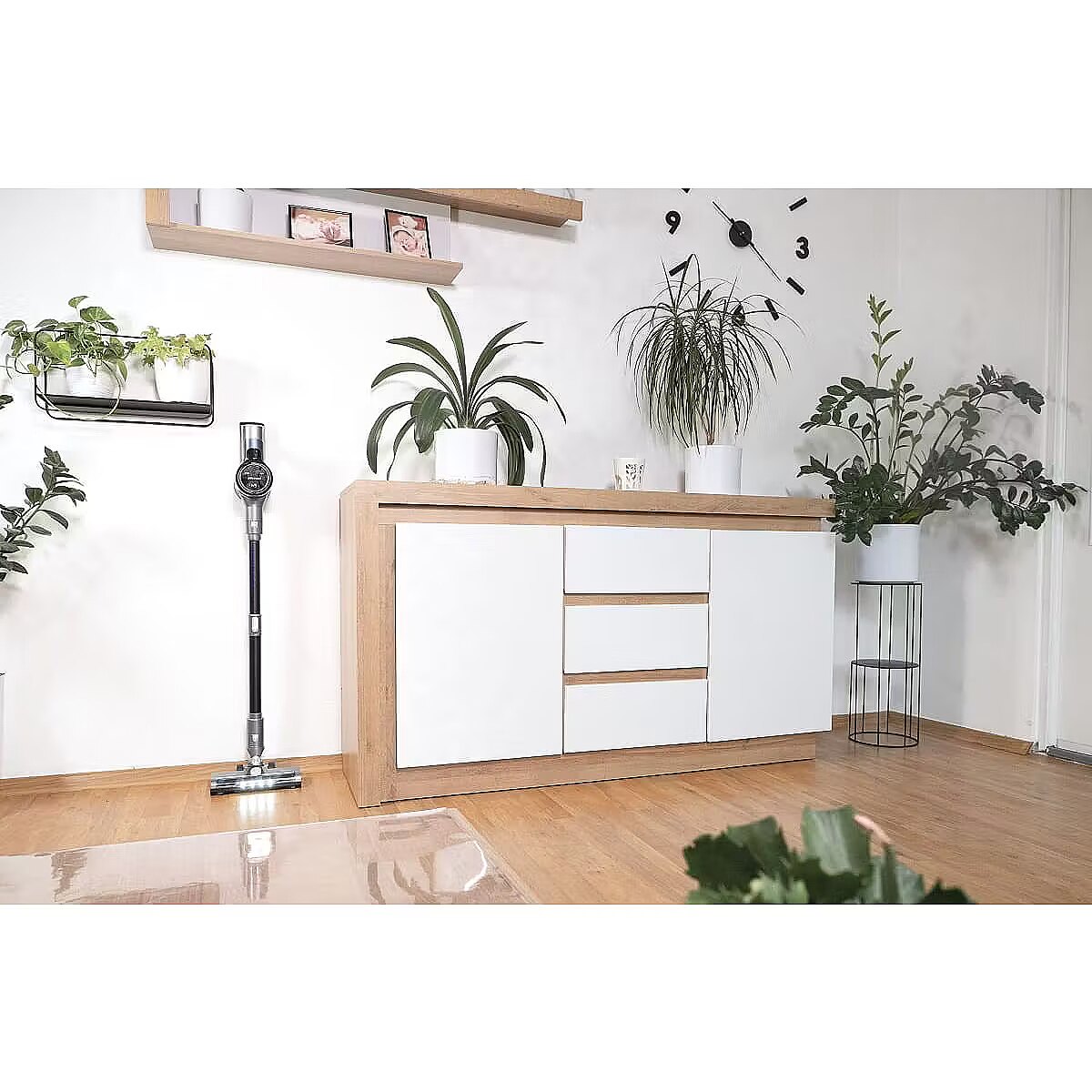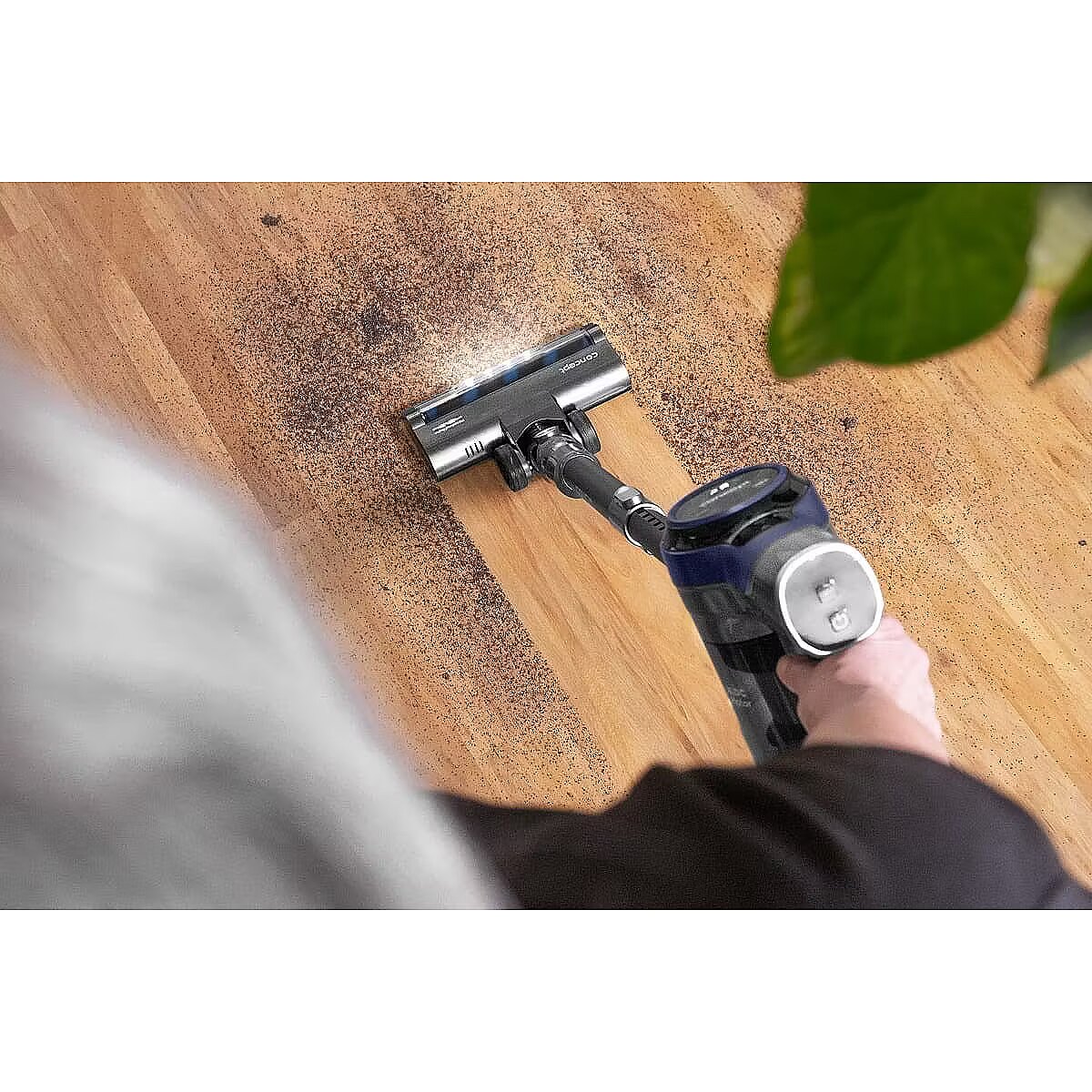 Akumulator Li-Ion o pojemności 2200 mAh zapewnia odkurzaczowi moc, którą możesz wybierać spośród trzech trybów. Po uruchomieniu pracuje na najniższej mocy, która jest odpowiednia do regularnego czyszczenia twardych podłóg. Moc ssania sięga 10 kPa, a czas pracy to aż 40 minut. Do dywanów i powierzchni silnie zabrudzonych zalecamy stosować moc maksymalną przy sile ssania 20 kPa, co jednak skróci czas pracy odkurzacza. Na wyświetlaczu cyfrowym możesz zobaczyć wybrany tryb i aktualny stan baterii w procentach. Jest też wskaźnik pełnego pojemnika na kurz i zablokowanej szczotki.