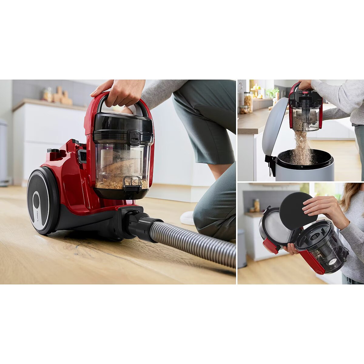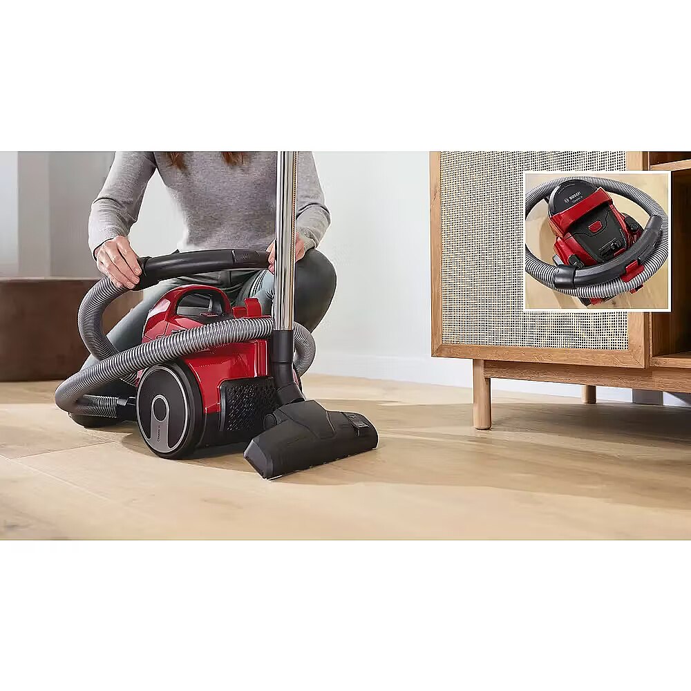 LongSummaryDescription - Bosch Serie 2 BGC05AAA2. Maximum input power: 700 W. Type: Cylinder vacuum, Cleaning type: Dry, Dust container type: Bagless, Dust capacity: 1.5 L. Vacuum air filtering: HEPA, Dirt separating method: Cyclonic, Noise level: 78 dB. Product colour: Black, Red