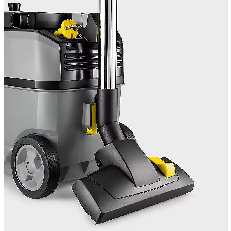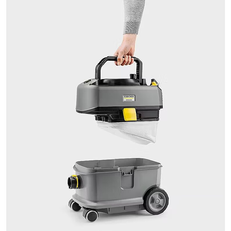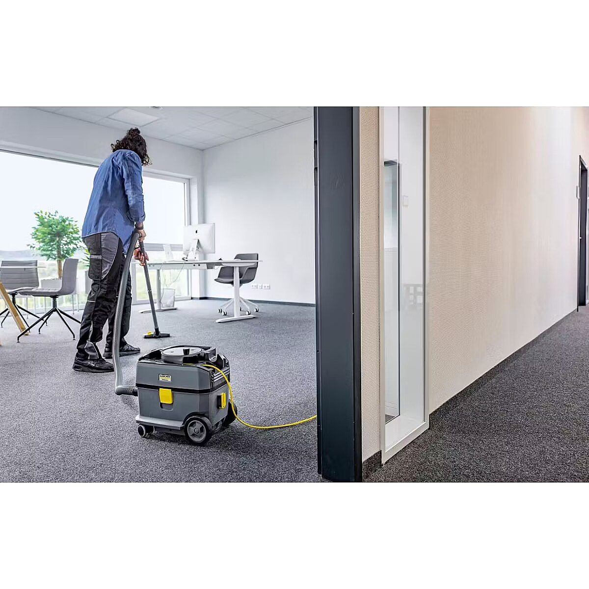 Description - Odkurzacz do pracy na sucho T 10/1 firmy Kärcher składa się w 45% z materiałów pochodzących z recyklingu*, co w procesie produkcji pozwala oszczędzać zasoby naturalne i energię. Imponuje pierwszorzędną mocą ssania, trwałością, wytrzymałością i wyjątkowym stosunkiem ceny do wydajności. Pomimo wysokiej mocy ssania odkurzacz T 10/1 pracuje na poziomie zaledwie 52 dB(A), dzięki czemu jest wyjątkowo cichy, co pozwala na jego bezproblemowe użytkowanie podczas sprzątania w ciągu dnia w miejscach wrażliwych na hałas. Kompaktowe urządzenie oferuje wygodny, składany uchwyt do przenoszenia, zapewniający ergonomiczny transport. Model T 10/1 jest zwrotny i odporny na przechylanie. Pojemność zbiornika odkurzacza wynosi 10 litrów. O trwałości i solidności świadczy jakość wykonania podwozia, obudowy, zderzaka i dużych kół. Ssawka szczelinowa wchodząca w zakres dostawy może być przechowywana w zintegrowanym schowku na akcesoria znajdującym się na urządzeniu T 10/1, dzięki czemu jest zawsze pod ręką. Opcjonalnie można zakupić wysoce wydajny filtr HEPA 14. Zrównoważony i wytrzymały: 45% materiałów pochodzących z recyklingu Produkcja: mniejsze zużycie surowców i energii. Użycie materiałów pochodzących z recyklingu obniża emisję CO.Odkurzacz jednofunkcyjny T 10/1: Bardzo cichy: praktycznie bezgłośna praca na poziomie zaledwie 52 dB(A) Bardzo cichy: praktycznie bezgłośna praca na poziomie zaledwie 52 dB(A) Idealny do czyszczenia w ciągu dnia. Mniejsze zanieczyszczenie hałasem nawet w nocy. Zmniejsza ryzyko, takie jak stres lub uszkodzenie słuchu.Odkurzacz jednofunkcyjny T 10/1: Ergonomiczna, kompaktowa i przyjazna dla użytkownika konstrukcja Ergonomiczna, kompaktowa i przyjazna dla użytkownika konstrukcja Ergonomiczny transport: może być noszony blisko ciała.  Ergonomiczne kolanko i wygodny uchwyt do przenoszenia. Oszczędność miejsca i inteligentne rozwiązania: łatwe przechowywanie.