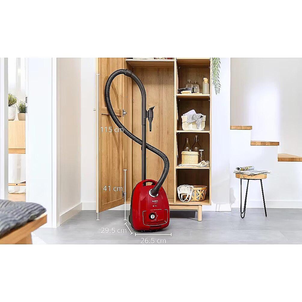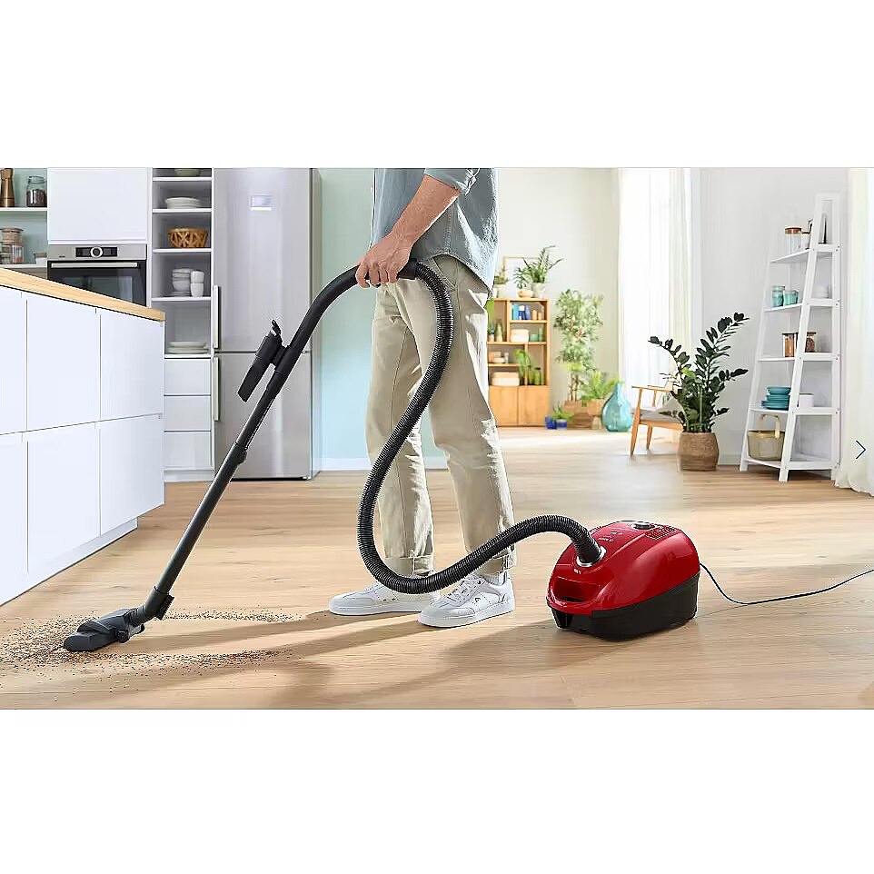 LongSummaryDescription - Bosch Serie 4 BGD38RD1H. Maximum input power: 600 W. Type: Drum vacuum, Cleaning type: Dry, Dust container type: Dust bag, Dust capacity: 4 L. Vacuum air filtering: Micro, Dirt separating method: Filtering, Noise level: 79 dB. Product colour: Red