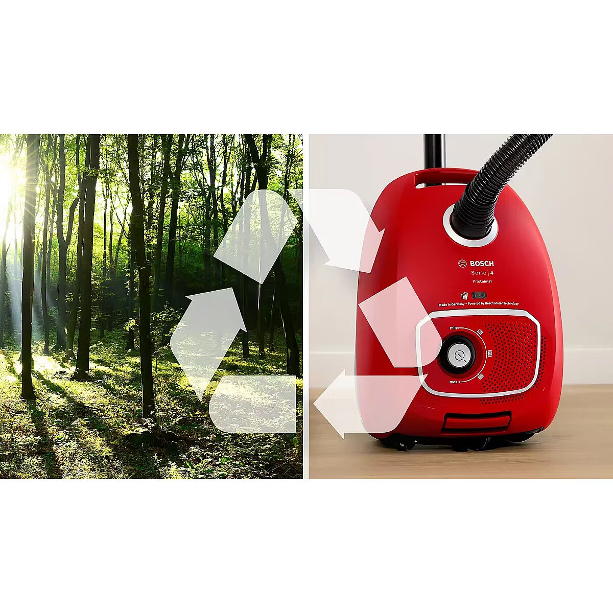 Description - Technologia Silników Bosch - moc "Made in Germany". Ciesz się wysoką i stałą wydajnością dzięki odkurzaczom marki Bosch: Projektując i produkując nasze wysokowydajne silniki w Niemczech od ponad 65 lat, oczekujemy, że odkurzacz nie tylko zapewni optymalne rezultaty sprzątania, ale także będą służyć przez lata - co zapewniamy naszą 10-letnią gwarancją na silnik. Łatwe usuwanie sierści ze wszystkich rodzajów podłóg. Wiemy, że sierść zwierząt potrafi być naprawdę uciążliwa, zwłaszcza kiedy uparcie przylega do każdego rodzaju podłóg. Z pomocą przychodzi nasza turboszczotka AirTurbo Pro, która została specjalnie zaprojektowana do odkurzania sierści ze wszystkich powierzchni o 50% szybciej. Od teraz będziesz mógł cieszyć się czystym domem i nie będziesz musiał martwić się o uporczywą sierść zwierząt. Sprzątanie nigdy nie było tak proste i szybkie. Akcesoria zawsze pod ręką. Zyskaj wygodę odkurzania dzięki zintegrowanemu schowkowi na akcesoria. Ssawka szczelinowa i ssawka do tapicerki są bezpośrednio wpasowane wewnątrz obudowy odkurzacza, dzięki czemu zawsze masz je pod ręką, gdy ich potrzebujesz. Zmieniaj akcesoria bez problemu - w zależności od wykonywanych czynności. A po odkurzaniu, nie musisz przechowywać akcesoriów oddzielnie od odkurzacza. Świeże powietrze podczas odkurzania. Worki wymienne AirFresh zapobiegają rozwojowi nieprzyjemnych zapachów dzięki technologii węgla aktywnego. Filtrują aż 99,9% drobnych cząsteczek kurzu. Praktyczne zamknięcie worka zapewnia jego higieniczna wymianę. Szczególnie polecany dla właścicieli zwierząt domowych. 99,9% skuteczności odkurzania z siłą huraganu. Doskonałe rezultaty odkurzania wymagają czegoś więcej niż tylko mocy. Skuteczne odkurzanie wymaga współdziałania wszystkich części odkurzacza - silnika o dużej prędkości, wydajnej ssawki, zoptymalizowanego uszczelnienia oraz filtra. Nasz mocny silnik Bosch wytwarza pod ssawką przepływ powietrza o prędkości do 150 km/h. Wszystkie komponenty są tak zoptymalizowane, aby zapewnić skuteczność odkurzania na poziomie powyżej 99,9%. Ta wyjątkowa wydajność zapewnia łatwe odkurzanie i doskonałe rezultaty sprzątania. Antyalergiczny filtr HEPA - lepsza jakość powietrza. Wierzymy, że dobra jakość powietrza jest ważna. Oddychaj swobodnie z filtrem antyalergicznym HEPA: dzięki niemu powietrze wydmuchiwane z odkurzacza jest czystsze niż powietrze otoczenia. Filtruje 99,95% drobnych cząstek kurzu, bakterii i zanieczyszczeń - dlatego jest idealny dla alergików. Przyjazny dla środowiska: filtr jest zmywalny, a ramka filtra jest wykonana w 100% z tworzywa sztucznego pochodzącego z recyklingu. Możesz go użyć kilka razy, zmniejszając w ten sposób dodatkowe koszty i oszczędzając materiały związane z jego wymianą. Jeśli potrzebujesz nowego filtra, po prostu wymień jego wkład. Optymalne rezultaty odkurzania na wszystkich rodzajach podłóg dzięki regulacji mocy silnika. Wydajne zarządzanie pracą silnika dzięki Power Control - precyzyjna regulacja i cechy haptyczne pokrętła gwarantują płynną zmianę mocy podczas odkurzania dywanów i twardych podłóg, zapewniając optymalną skuteczność odkurzania. Rzadsze wymiany worków i mniejsze koszty. Poczuj moc odkurzania z naszym workiem na kurz w rozmiarze XL. Nasz odkurzacz został zaprojektowany, aby pomieścić worek o dużej pojemności, wydłużając tym samym czas odkurzania na jednym worku dzięki temu zapewnia mniejsze koszty związane z jego wymianą. Oszczędność zasobów i długotrwała jakość. Marka Bosch jest zaangażowana w zrównoważony rozwój, dlatego jej urządzenia są opracowywane z myślą o ochronie środowiska i oszczędności zasobów. Dlatego ten odkurzacz jest wykonany w 32% z tworzyw pochodzących z recyklingu, podczas gdy jego opakowanie składa się w 95% z papieru pochodzącego z recyklingu - zawiera również foliowe worki, które są kompostowalne i nadają się ponownego przetworzenia. Natomiast dzięki trwałemu i wysokiej jakości silnikowi Bosch wyprodukowanemu w Niemczech, będziesz cieszyć się urządzeniem przez długi czas.