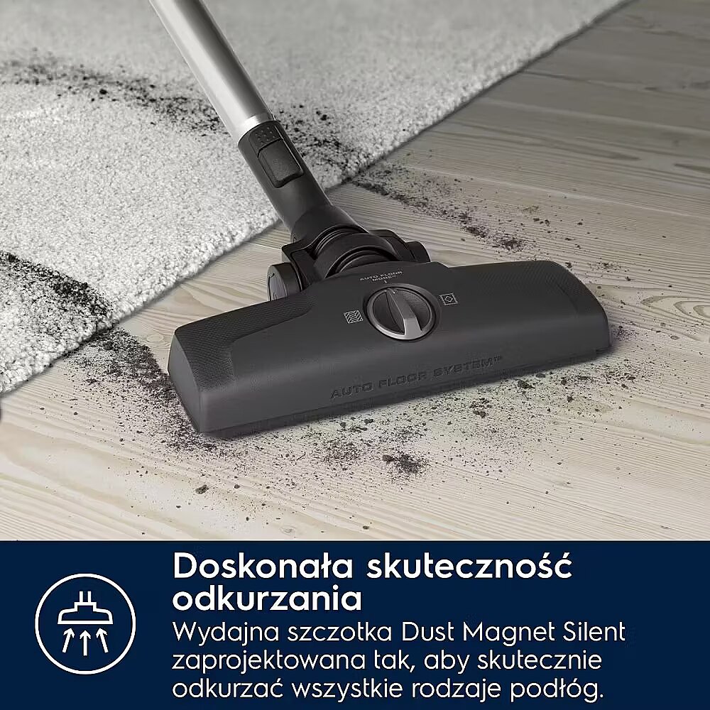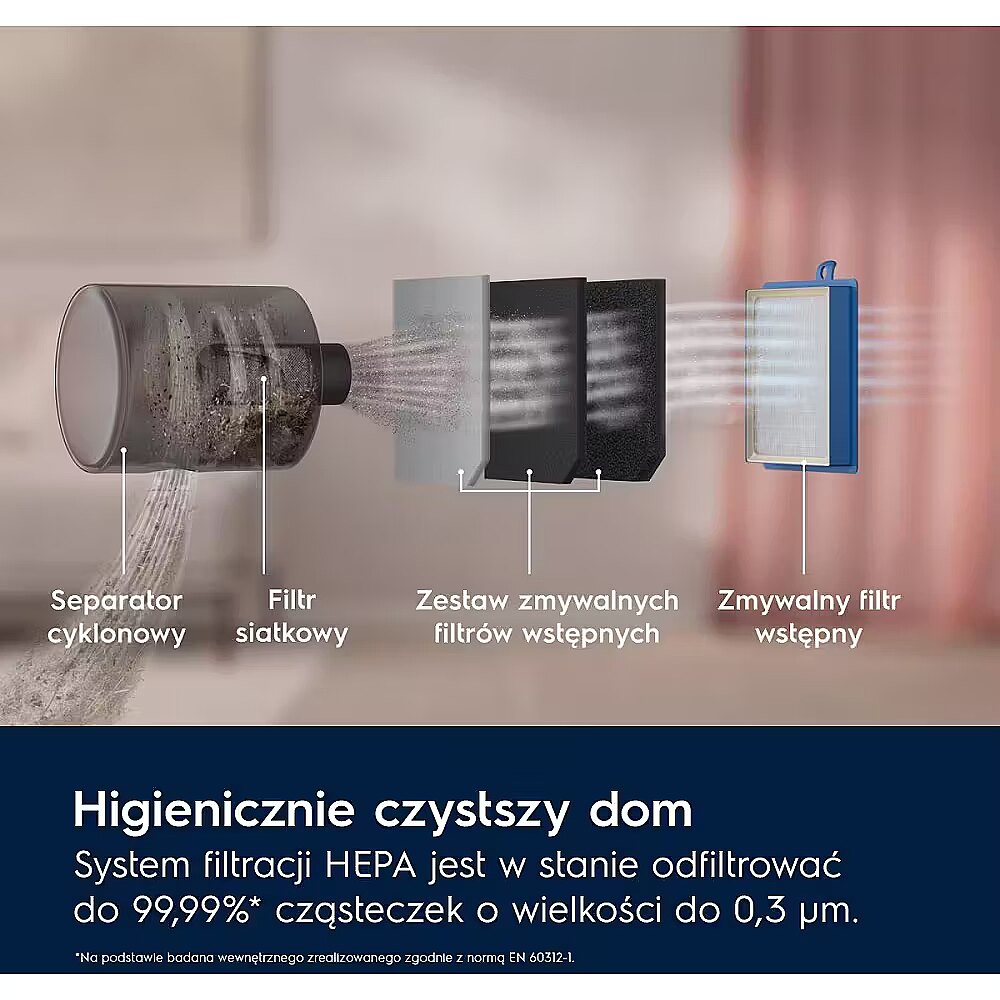 The cyclonic system ensures reliable performance from start to finish, even with a full container. It retains up to 99% of its initial vacuuming power after the container is filled, at the maximum power setting, in accordance with IEC 62885-2, version 1.0: 5.1, 5.7, and 5.9.