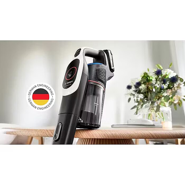 ShortSummaryDescription - Bosch BCS931WBA, Stick vacuum, Bagless, White, 0.4 L, Dry, HEPA