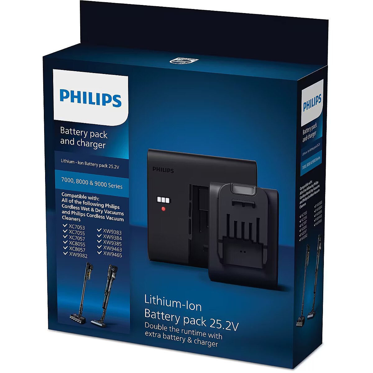 Description - Battery and charger Lithium-ion battery 25.2VLithium-ion battery pack, 25.2 V, compatible with Philips cordless wet and dry vacuum cleaners and Philips cordless vacuum cleaners XC6552, XC6553, XC6557, XC7053, XC7055, XC7057, XC8053, XC8054, XC8055, XC8057, XW9383, XW9385, XW9463 and XW9465.