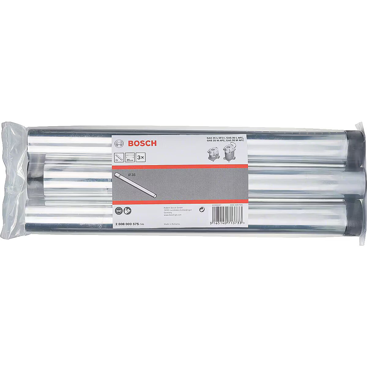 Technical_details - Type: tube Colour: chrome EAN: 3165140713733 Manufacturer number: 2608000575 Material: metal, chrome-plated Suitable for: Wet/dry vacuum cleaners Compatible with: GAS12-25/12-25HP, GAS 15HP, GAS 25L SFC, GAS 35H AFC, GAS 35L AFC, GAS 35L SFC+; GAS 35M AFC, GAS 50, GAS 50M, GAS 55M AFC Professional Set: 3 pieces Dimensions: Length: 0.35 meters : 35mm