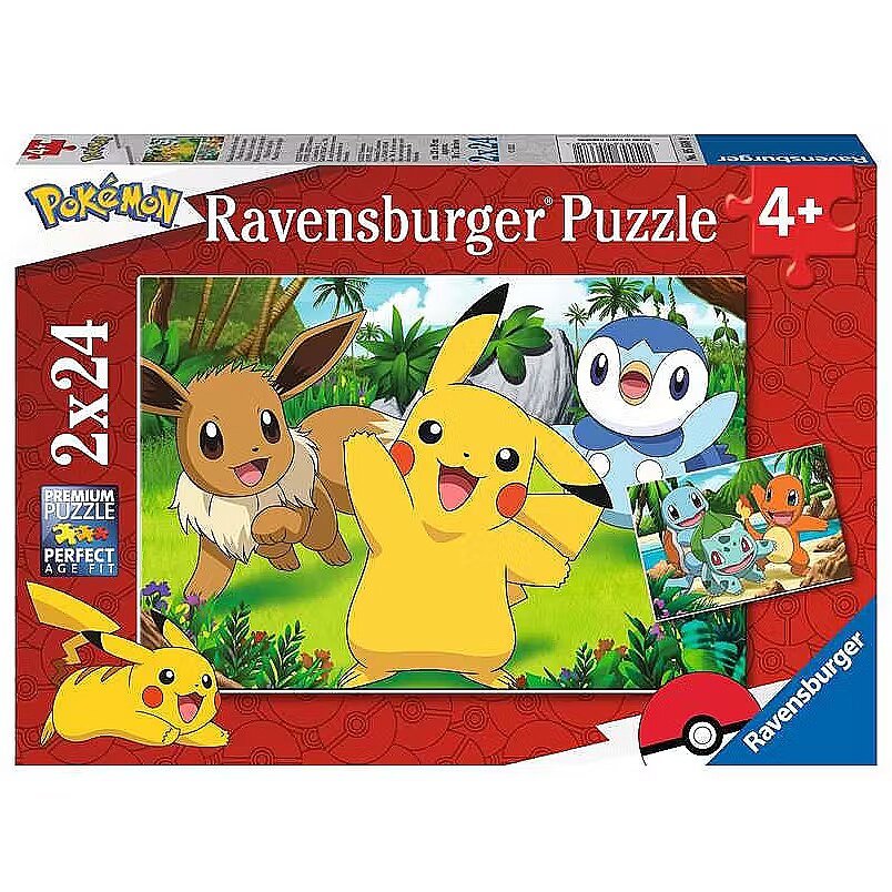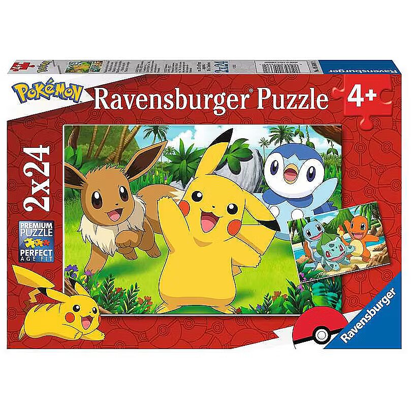 Description - 2D puzzle for children: Pokemon 2x24 pieces Immerse yourself in the world of Ravensburger puzzles and discover amazing images! Imagine that wonderful feeling when you find one item, exactly the one you need, and the moment when it fits perfectly in just that one place. And when you feel the satisfaction of creating the perfect image, piece by piece. Beautiful landscapes, famous cities, unknown places, wildlife and underwater scenery, animals, art - our wonderful selection of images, colors and styles delights and unites the entire world of puzzle lovers. For over 130 years, the Ravensburger logo has been a guarantee of the highest quality and great fun. As a puzzle expert with extensive experience, we use exclusively developed materials, handcrafted precision tools and meticulous quality control to ensure that every piece fits together perfectly and every puzzle is complete. This is for everyone! Among our 2D puzzles, everyone, regardless of age and skill level, will find the right challenge for themselves, from 2 to 42,000 elements, from tiny pieces to large format puzzles, from landscapes to panoramas, from wild animals to children's cartoon characters, from licensed products to puzzles with hidden puzzles to solve, all in exceptional quality thanks to our own production. We have created the perfect selection taking into account every taste and every level of difficulty. It does a lot of good! Putting together puzzles stimulates brain development from an early age and develops confidence in one's own abilities. The pictures present interesting motifs that are close to children, introducing them to the world around them. This is an excellent memory and concentration training, which also teaches shape recognition and exercises manual dexterity of the hands. It's a great way to practice perceptiveness, logical thinking, patience and coordination. When solving a puzzle, both hemispheres of the brain work simultaneously. It is also a way to calm down, concentrate, and focus on one thing at a time. Solving puzzles on our own allows us to de-stress and forget about the problems surrounding us, while solving puzzles together is a pleasant time spent, strengthening relationships and bringing us closer to each other. Why Ravensburger puzzles? High quality material: Made of patented, thick cardboard with soft lining, which makes them resistant to bending. Made of ecological materials. With clear motifs, thanks to the use of a natural linen structure that limits light reflection. With an easy-to-clean surface. Unique technology: Thanks to the patented SoftClick technology, the puzzles have unique shapes and fit only in one place. The puzzles come in various shapes thanks to a hand-made die. They are a perfect gift for people of all ages and for any occasion.